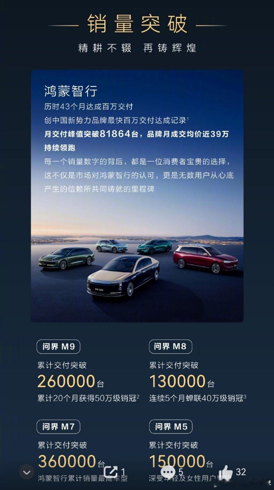 4年时间,问界就成豪华品牌,是不是太不可思议?颠覆百年规则?BBA靠时间及技术沉淀堆豪华:奔驰熬40年、宝马等60年、奥迪耗近80年,才攒下高端护城河,曾以为这是不可打破的行业铁律。在没人看好的情况下,问界仅用4年就掀翻格局,2021年底才亮相,如今全系均价39万碾压BBA主流车型,M9连续10个月霸榜50万级销冠,累计交付超90万辆,超60%车主弃BBA换问界,直接击碎老牌豪华的时间神话。这根本不是违背常识,而是新能源时代给了机会,技术变革打破了品牌建设的时间壁垒,妥妥时势造英雄!鸿蒙智行 南宁