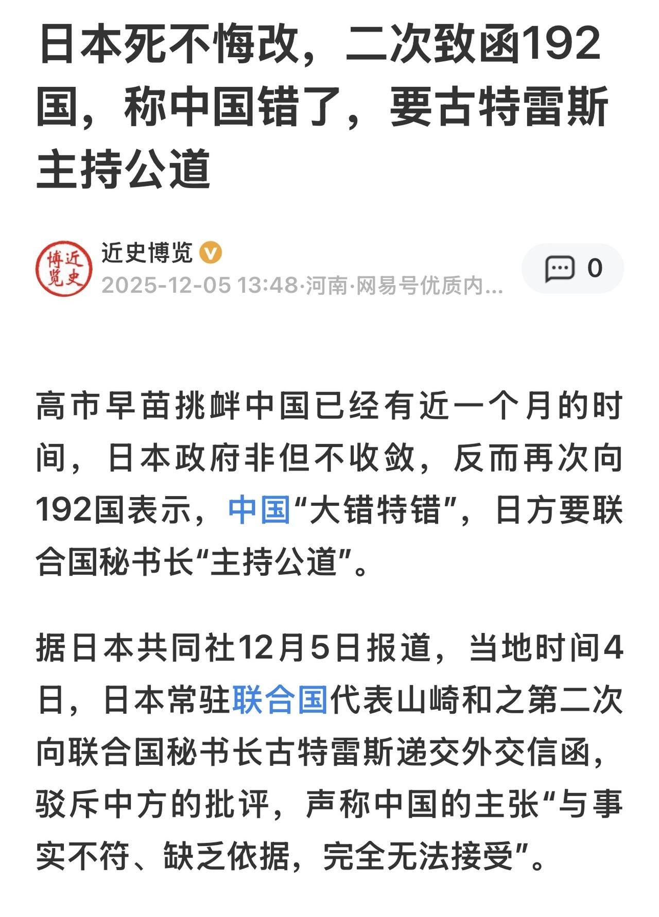 日本驻联合国代表再次致函联合国,声称“完全无法接受”中方涉台主张 中方代表此前已严正阐明立场,强调台湾问题纯属中国内政,任何外部武力干预均构成侵略,中国将坚决捍卫国家主权和领土完整。日方在回应中重复其“专守防卫”立场,并表示期待“和平解决”。中方随后驳斥日方说法,指出其回避关键问题、违背既有政治承诺,敦促日方恪守一个中国原则。