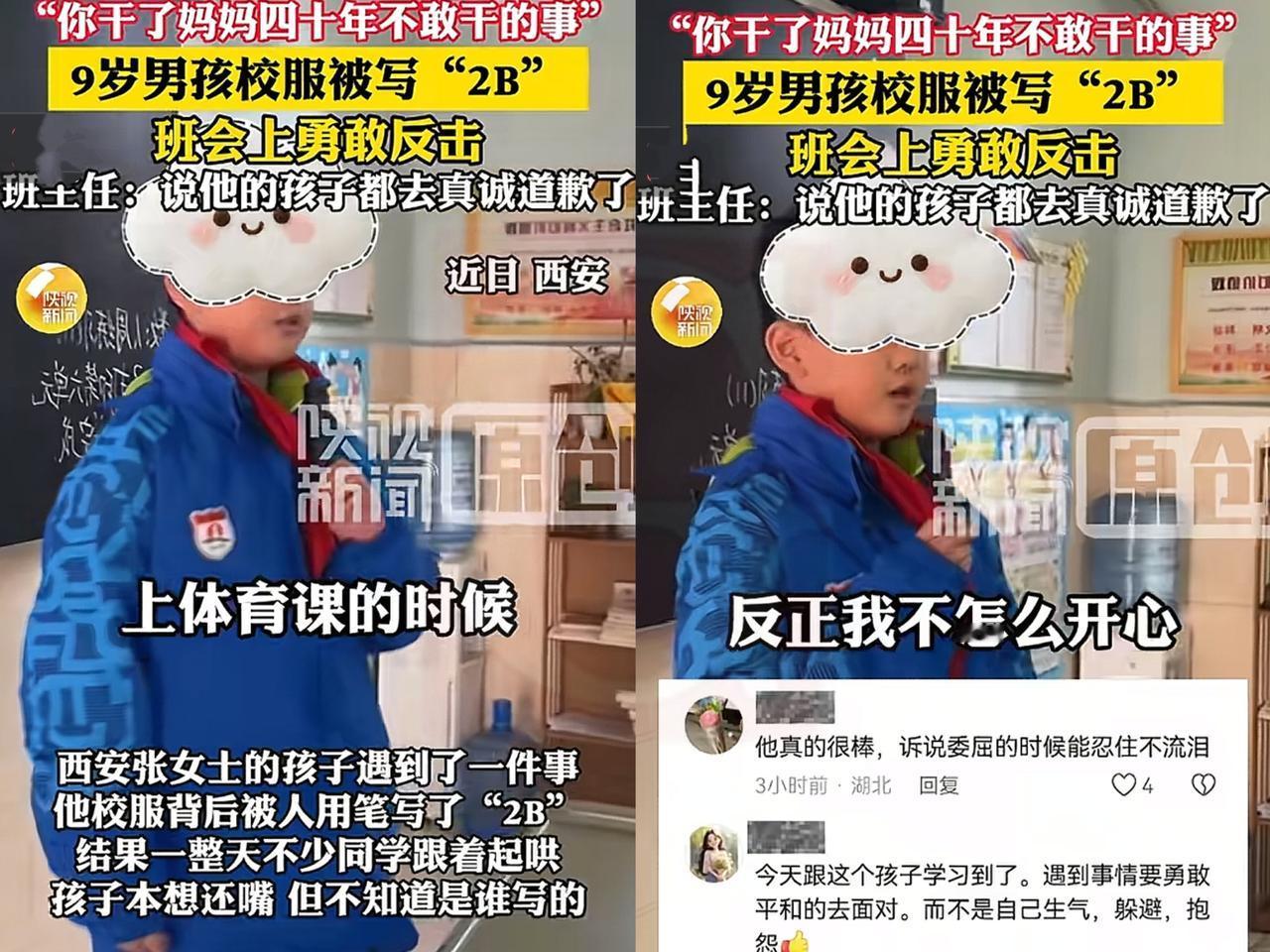 西安这位9岁男孩也太刚了!妈妈发现他校服背后被人写了“2B”,得知孩子被同学嘲笑了两天,气到想找班主任,结果男孩淡定表示:“妈妈,明天班会我自己解决!” 这操作,妈妈简直又骄傲又感动,直呼孩子干了自己40年都不敢做的事! 妈妈纠结一整晚,既担心孩子处理不好,又佩服他的勇气。想偷偷跟老师说,还被孩子拦住! 第二天班会上,男孩举动超酷,直接举起校服,冷静又有力量地让写脏话的同学意识到错误! 最后还主动递湿巾,邀请一起擦干净校服,化干戈为玉帛! 好多人说孩子早熟,可我觉得,这哪是早熟,分明是骨子里的通透和坦荡! 很多成年人遇到欺负,要么忍气吞声,要么撕破脸,反而不如一个9岁孩子看得通透! 你们说,遇到这种事,要是你会咋处理呀?