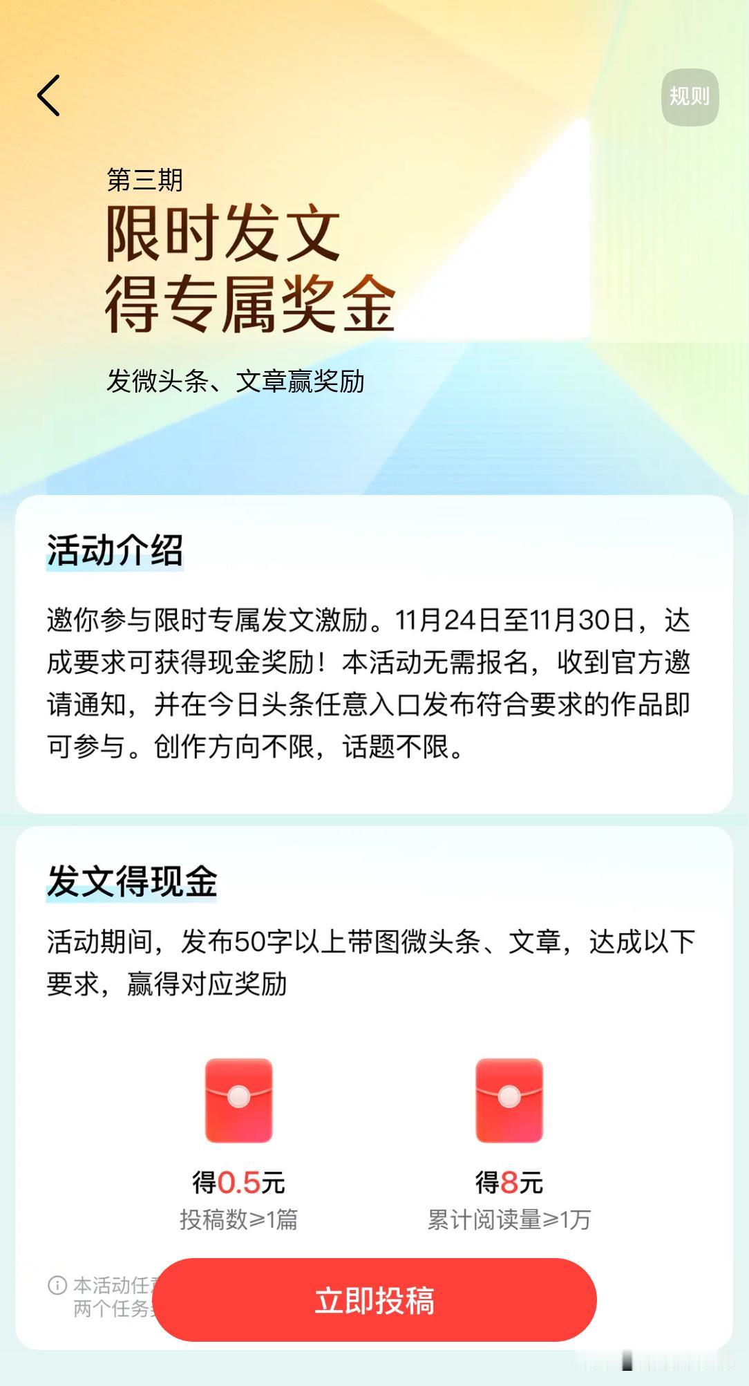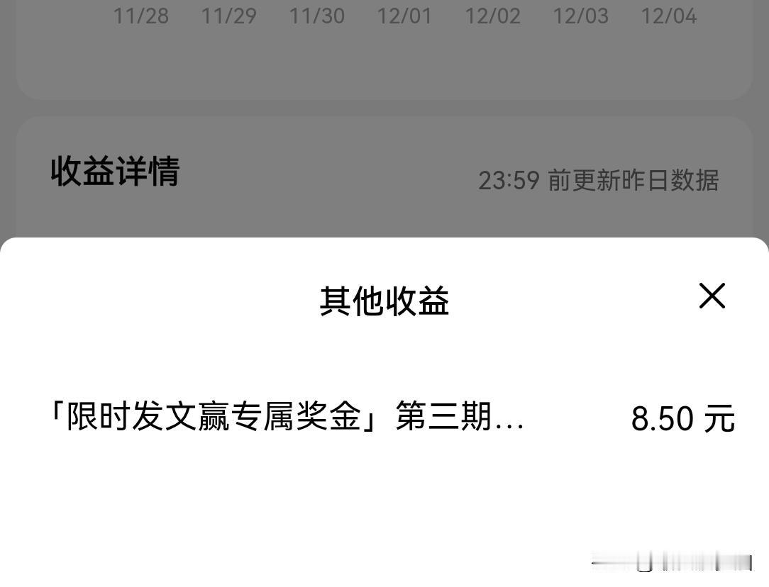 叮咚!奖金已到账~“限时发文得专属奖金第三期”活动发奖金啦!参加活动的小伙伴们!你们也收到了吗? 上周参加“限时发文得专属奖金第三期”活动,在活动期间(11月24~30日),发布50字以上带图微头条、文章,达成以下要求,赢得对应奖励: ①投稿数≥1篇🉐0.5元 ②累计阅读量≥1万🉐8元 活动已经结束一周,昨天奖金也已经到账。果真是“一顿操作猛如虎,喜提奖金八块五”啊! “限时发文得专属奖金”第三期的奖金比前面两期缩水太多了!第一、二期的奖金好歹有66元,没想到第三期只剩下8.5元! 头条家大业大,资金这么紧张吗?不应该啊! 辛辛苦苦写了一周,却只得到八块五!果然是人间不值得啊! 但转念一想,八块五好歹还能买两个鸡腿,瞬间又把自己哄好了! 这不禁让我想起了董宇辉的经典语录:“阳光到地球需要八分钟,你的努力也需要时间。耐心一些,持续修炼,匠心就是做好一件事,初心就是一直做好一件事。” 我来头条的初心不就是赚钱买鸡腿的吗?既然鸡腿已经得手,又何必在乎得手几个呢? [我想静静][笑哭][捂脸][我想静静][笑哭][捂脸][我想静静][笑哭]
