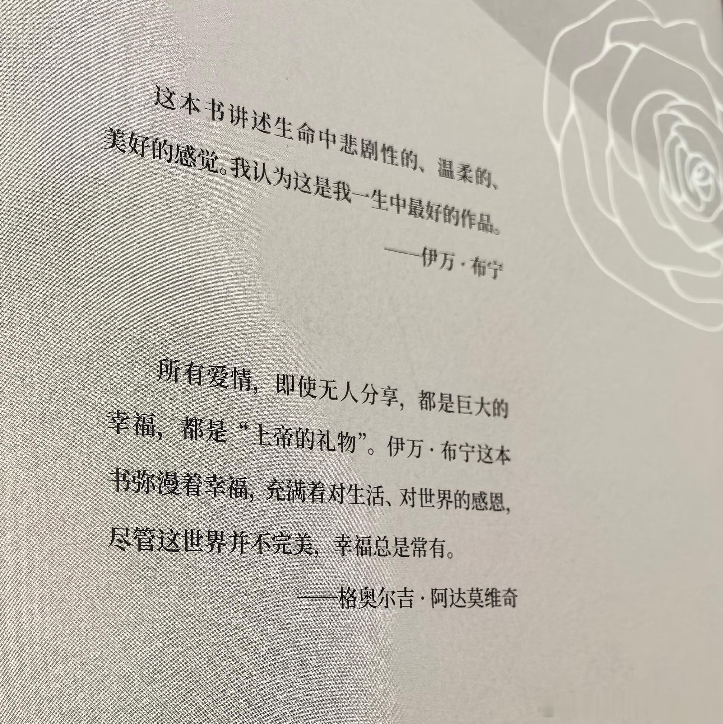 很久没有这样认真读一本书,也很久没有哪本书这样吸引了我。隽永低沉平缓宁静的文字,讲述着生命中悲剧性的、温柔的、美好的感觉。明天返程航班上,我应该就读完剩下的大约四分之一内容。不经意间发现,二十几篇小说,竟都是浅浅的悲剧,无一例外。尽管这世界并不完美,幸福总是常用吗?伊万.布宁︱暗径集