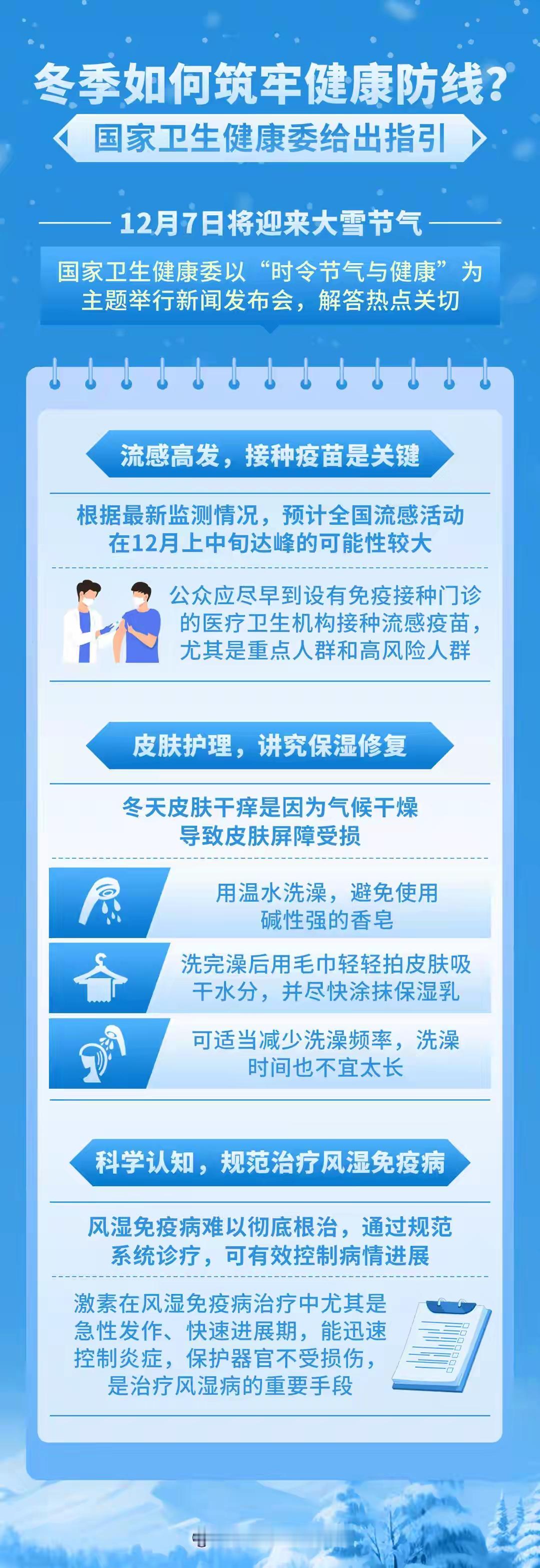 在冬季,随着气温下降和流感等传染病的高发,筑牢健康防线尤为重要。国家卫生健康委在12月7日大雪节气前夕,围绕“时令节气与健康”主题,发布了多项防控指南,帮助公众科学应对冬季健康挑战。 冬季健康防线的核心措施 1. 加强流感等呼吸道传染病的防控 接种疫苗:建议高危人群(如老人、慢性病患者、儿童)及时接种流感疫苗。 注意个人卫生:勤洗手、戴口罩、保持室内通风,减少交叉感染。 避免人群聚集:尽量减少去人多密集的公共场所,预防病毒传播。 2. 合理保暖,预防寒冷相关疾病 穿着得当:根据天气变化,适时增减衣物,尤其注意头部、颈部和四肢的保暖。 保持室内温暖:适度加热,避免室内过于干燥,使用加湿器或放置水盆。 3. 慢性病患者的冬季管理 按时服药:遵医嘱坚持用药,避免擅自停药或调整剂量。 合理饮食:多食用富含维生素和营养的食物,增强身体抵抗力。 适度运动:在天气允许的情况下,进行适当的户外运动,增强体质。 定期监测:关注身体变化,出现不适及时就医。 4. 提升免疫力,保持良好的生活习惯 保证充足睡眠:规律作息,增强身体免疫力。 均衡营养:多摄入新鲜水果、蔬菜和蛋白质。 适度锻炼:如散步、太极等温和运动,增强体质。 5. 关注特殊人群和易感人群 老年人、儿童、孕妇和慢性病患者应特别注意防寒保暖和疾病预防。 提供必要的健康指导和医疗保障。 结语 冬季是疾病多发的季节,科学防控、合理养生是保障健康的关键。国家卫生健康委提醒公众根据气候变化及时调整生活方式,做好个人和家庭的健康管理,共同筑牢冬季健康防线。 如果你需要更详细的防控措施或具体建议,也可以告诉我!