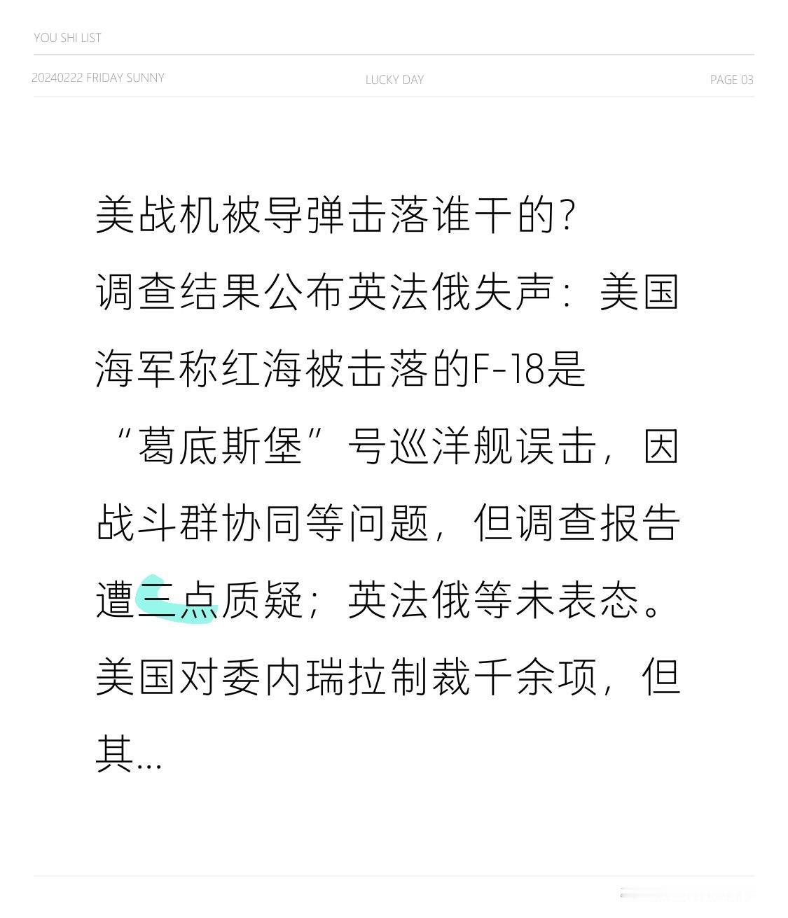 美战机被导弹击落谁干的?调查结果公布英法俄失声:美国海军称红海被击落的F-18是“葛底斯堡”号巡洋舰误击,因战斗群协同等问题,但调查报告遭三点质疑;英法俄等未表态。美国对委内瑞拉制裁千余项,但其石油出口增长、态度硬,战争难开;乌克兰问题想抽身,盟友不答应,当前陷入多线困境。