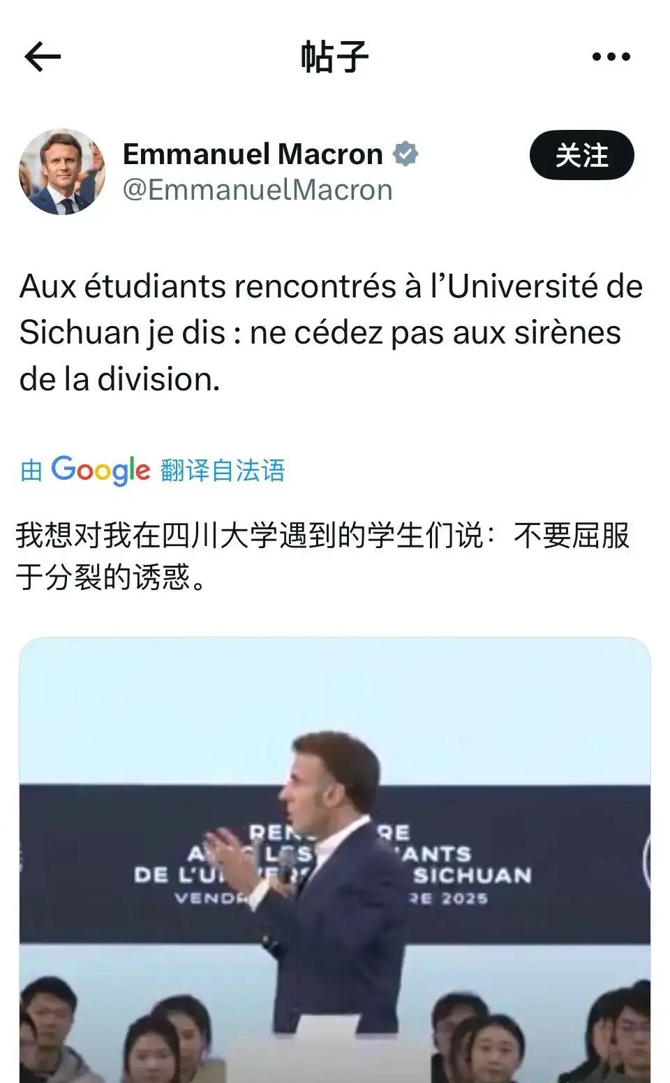 马克龙对四川大学的学生们说:不要屈服于分裂的诱惑! 这话怎么理解! 他是在一语双关吗? 应该不仅仅是指台湾问题吧?