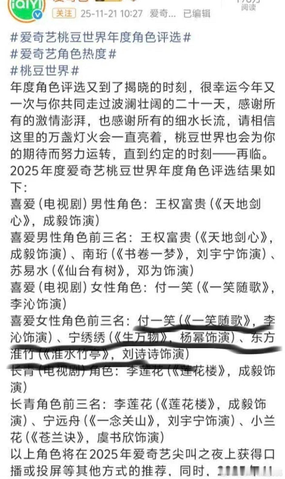 爱奇艺年度喜爱女性角色🥝对年度喜爱女性角色的榜单错误出来道歉了,🥝对白鹿是不