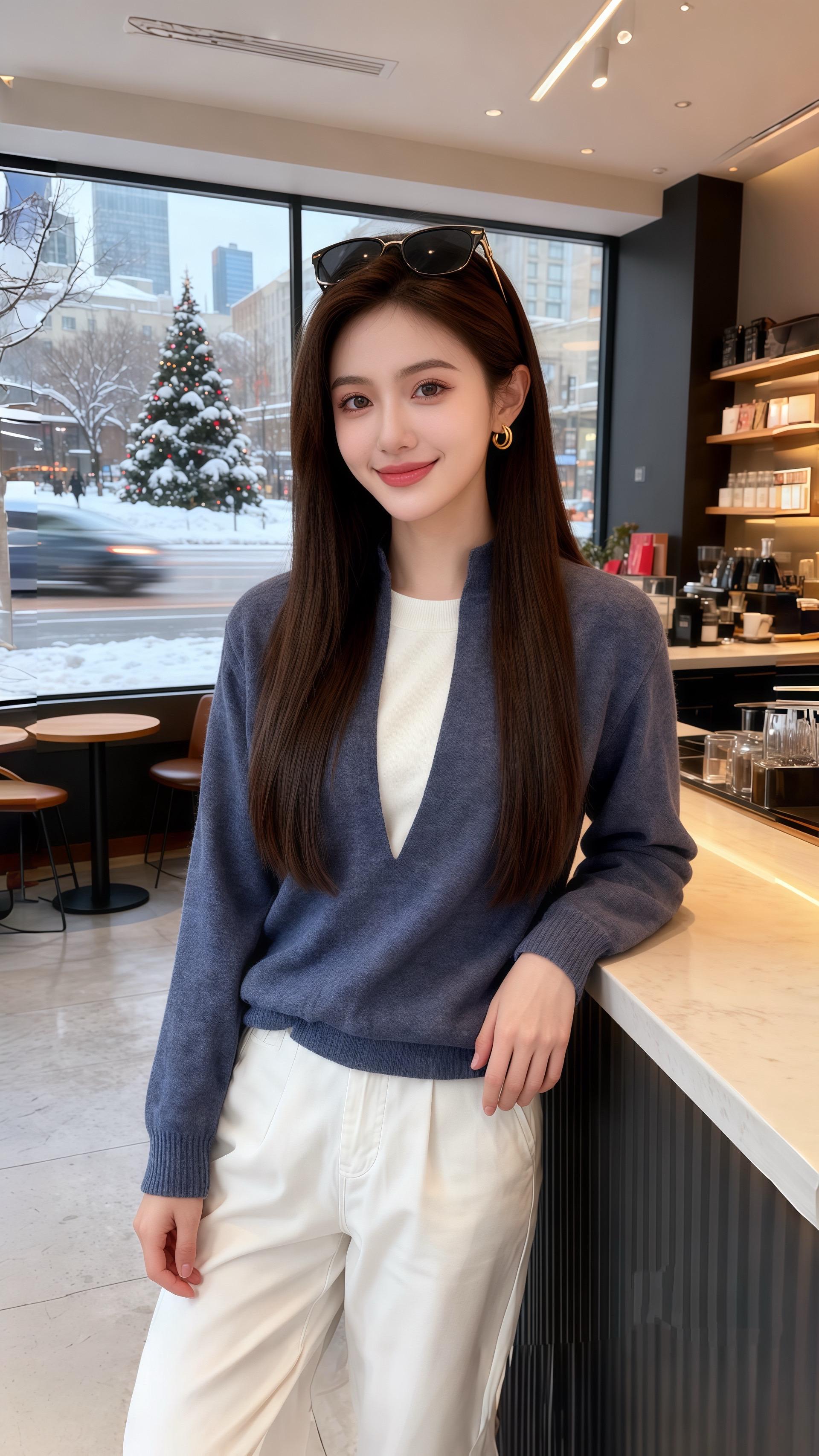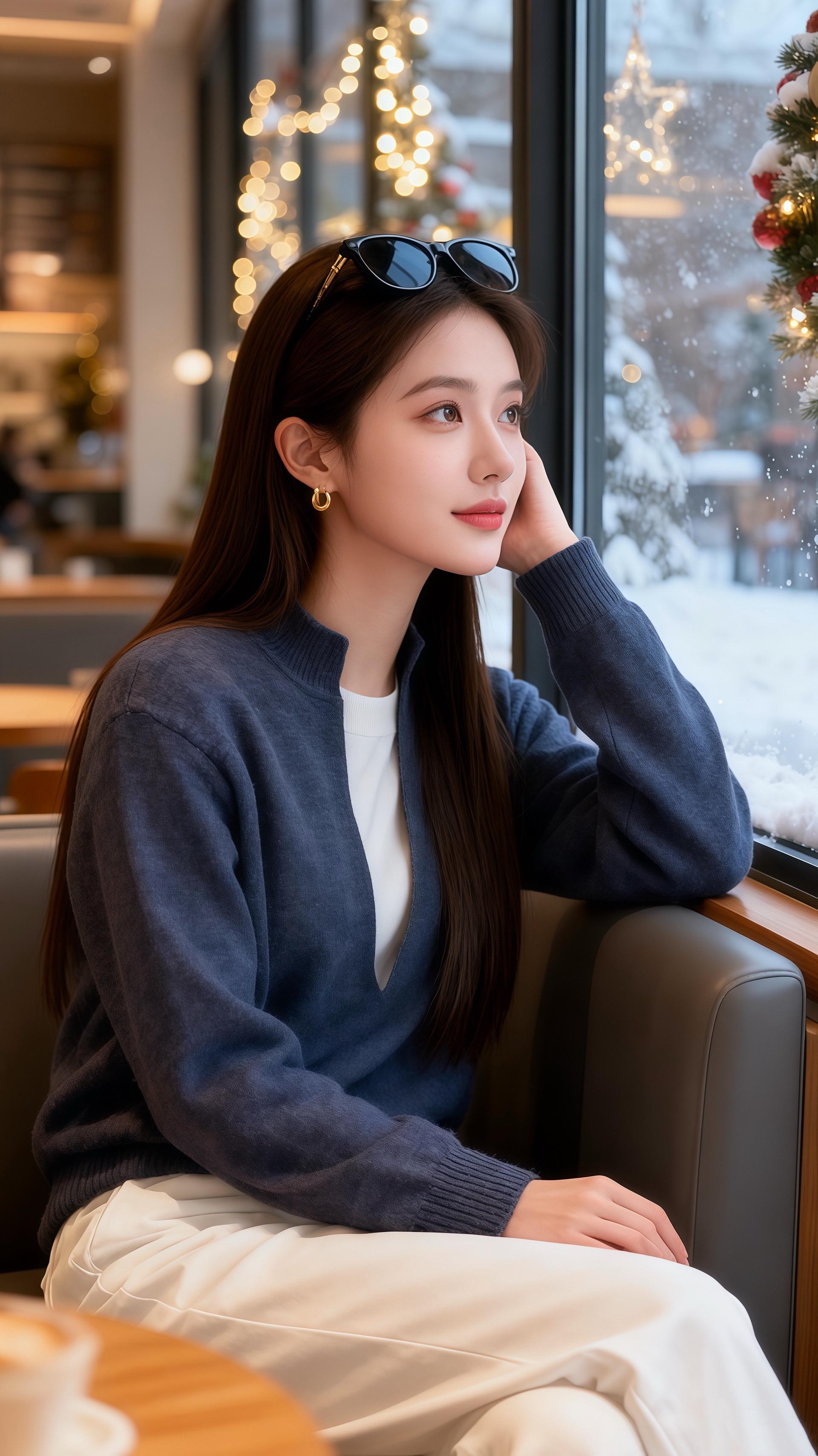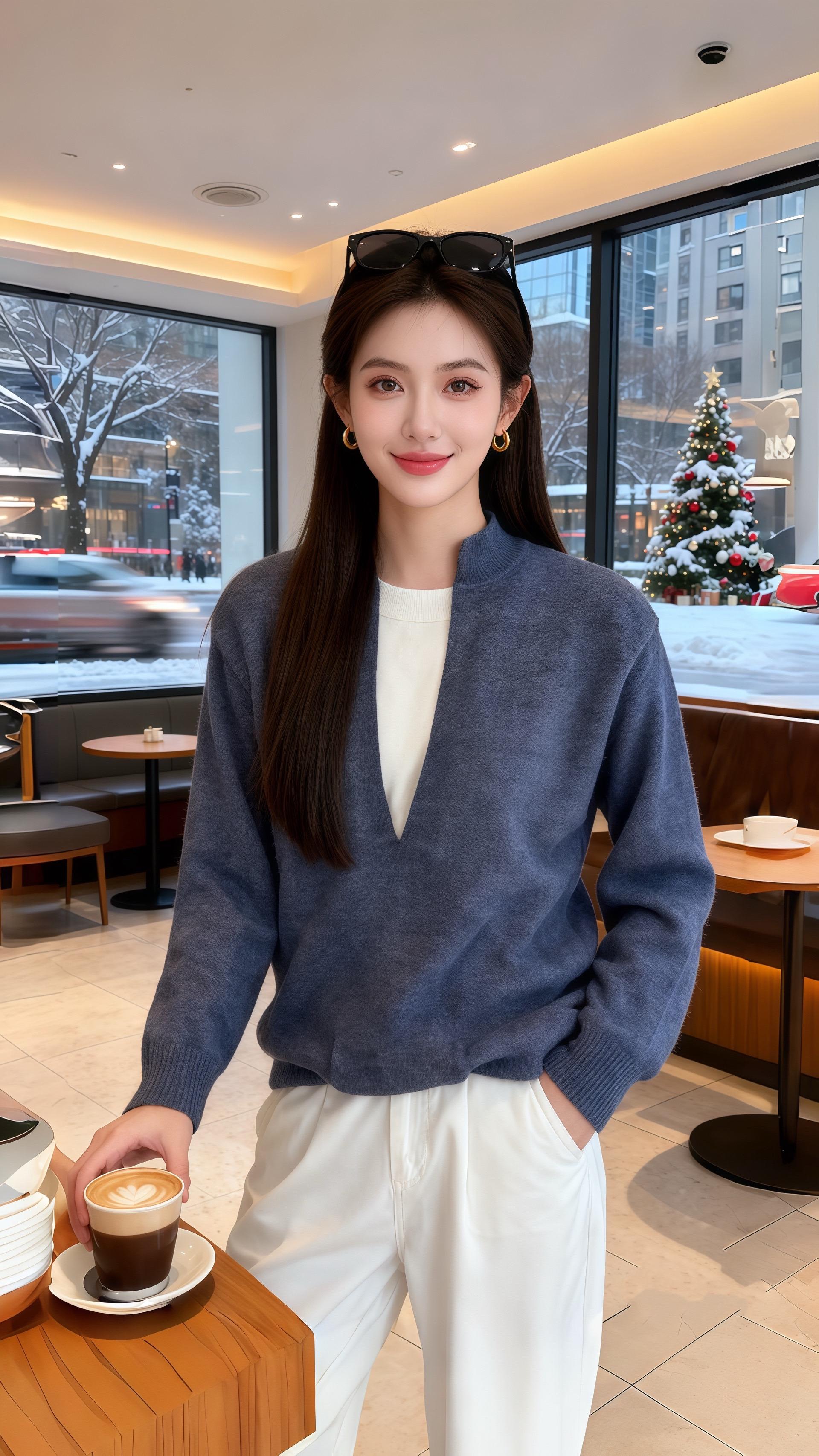 皓明拎着热可可走近,围巾还沾着细雪,视线先黏在她身上:“这针织衫穿在你身上,比挂在架上有味道多了。V领露的那点白内搭,比模特穿得多了点松弛的好看。”