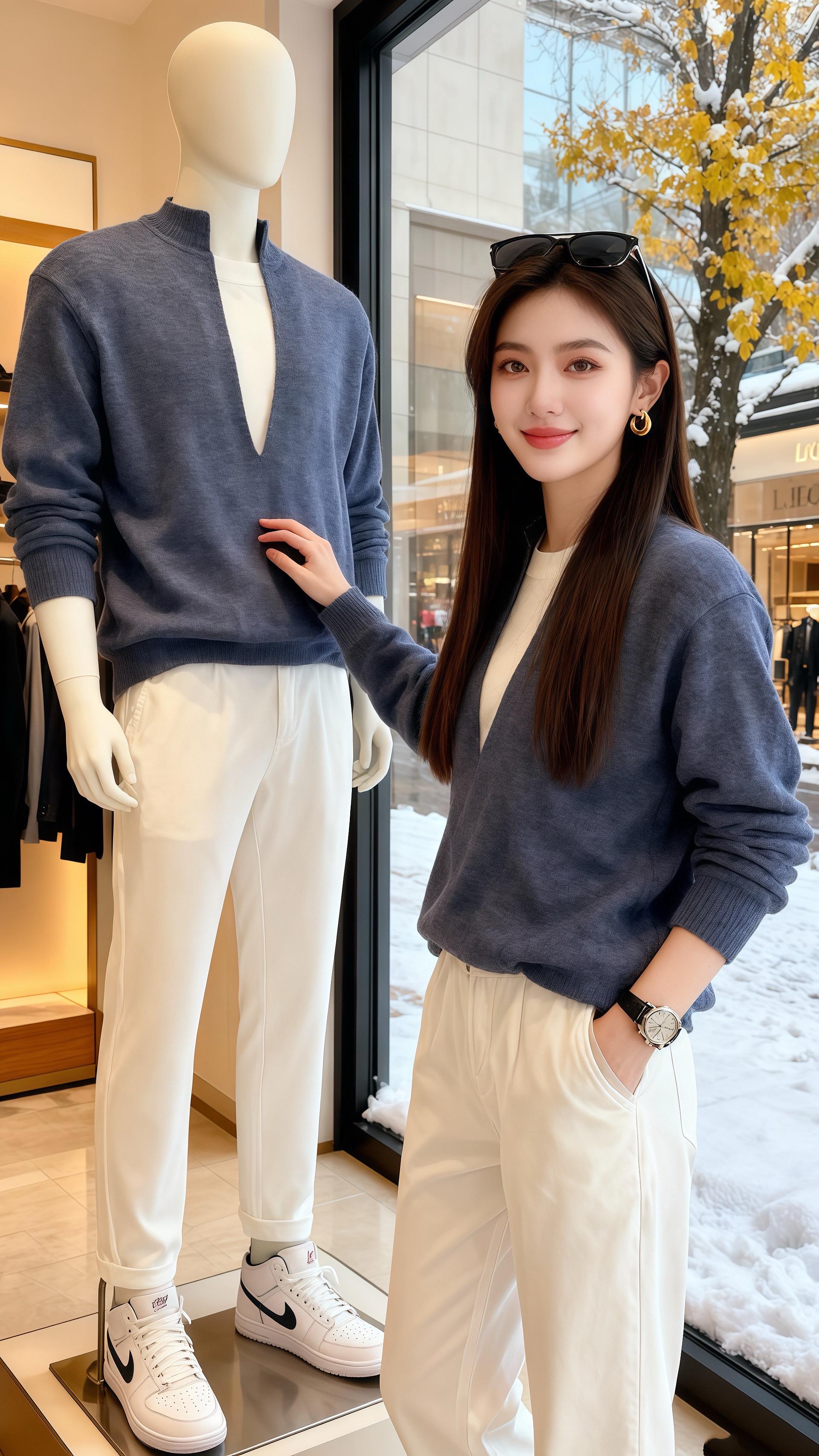 雪粒裹着松枝香飘进橱窗时,许妍正指尖碰着模特身上的藏青针织衫——和她穿的那件V领款一模一样,软绒的纹路顺着肩线弯出温软的弧。