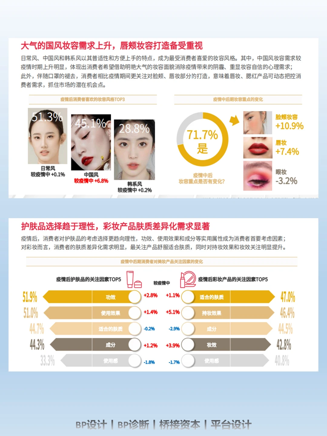 💄💁♀️ 普通女生也轻松get时尚?是的!据调查,在疫情期间,越来越多的人开始自学化妆,多个平台的直播带动了化妆新手从“0”到“1”的转化。在这样的背景下,线上化妆课程、直播、社交电商开始受到更多的关注。此外,消费者对于品牌的选择更加看重,对高质量、高性价比的产品更为追捧。
