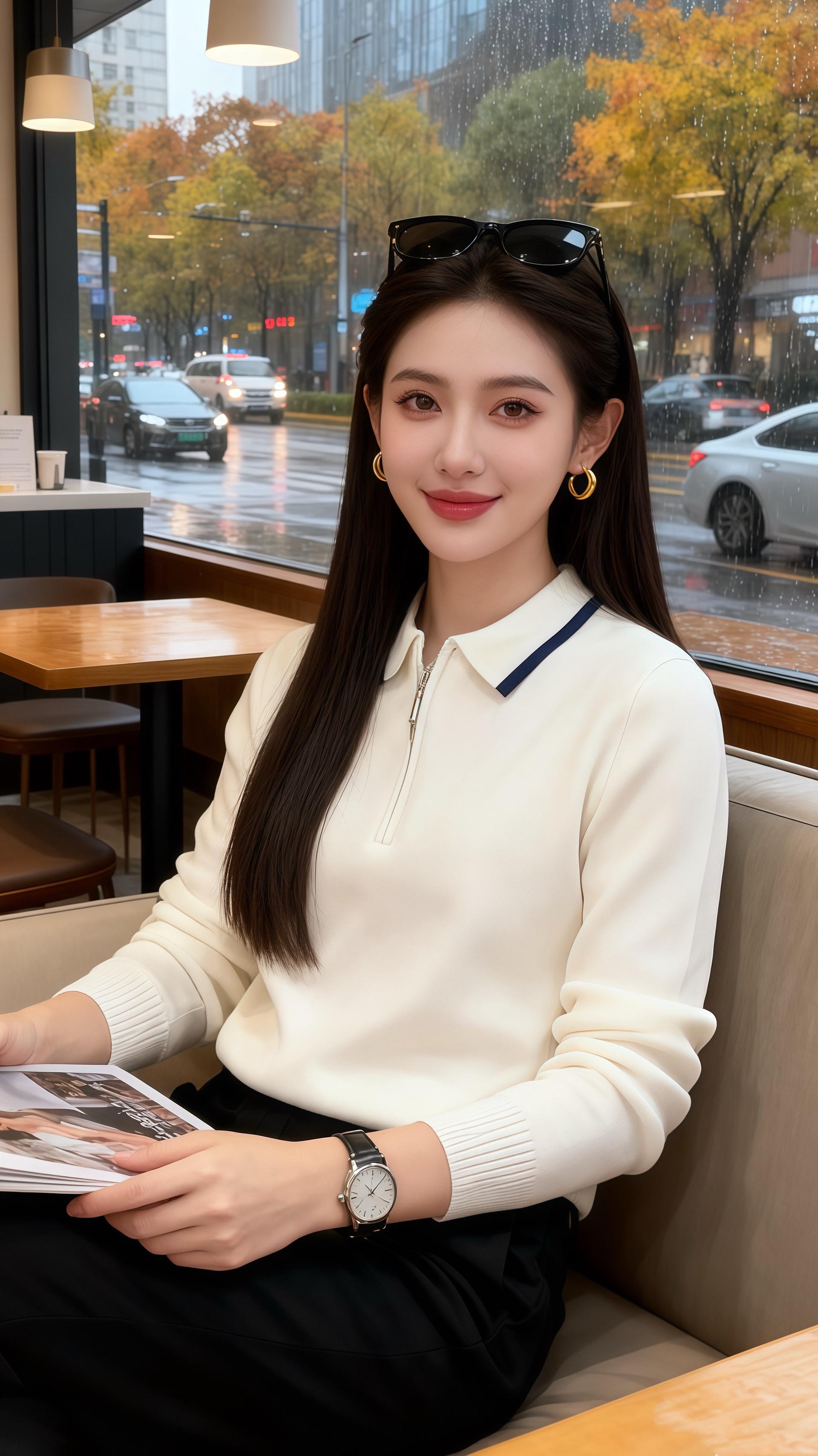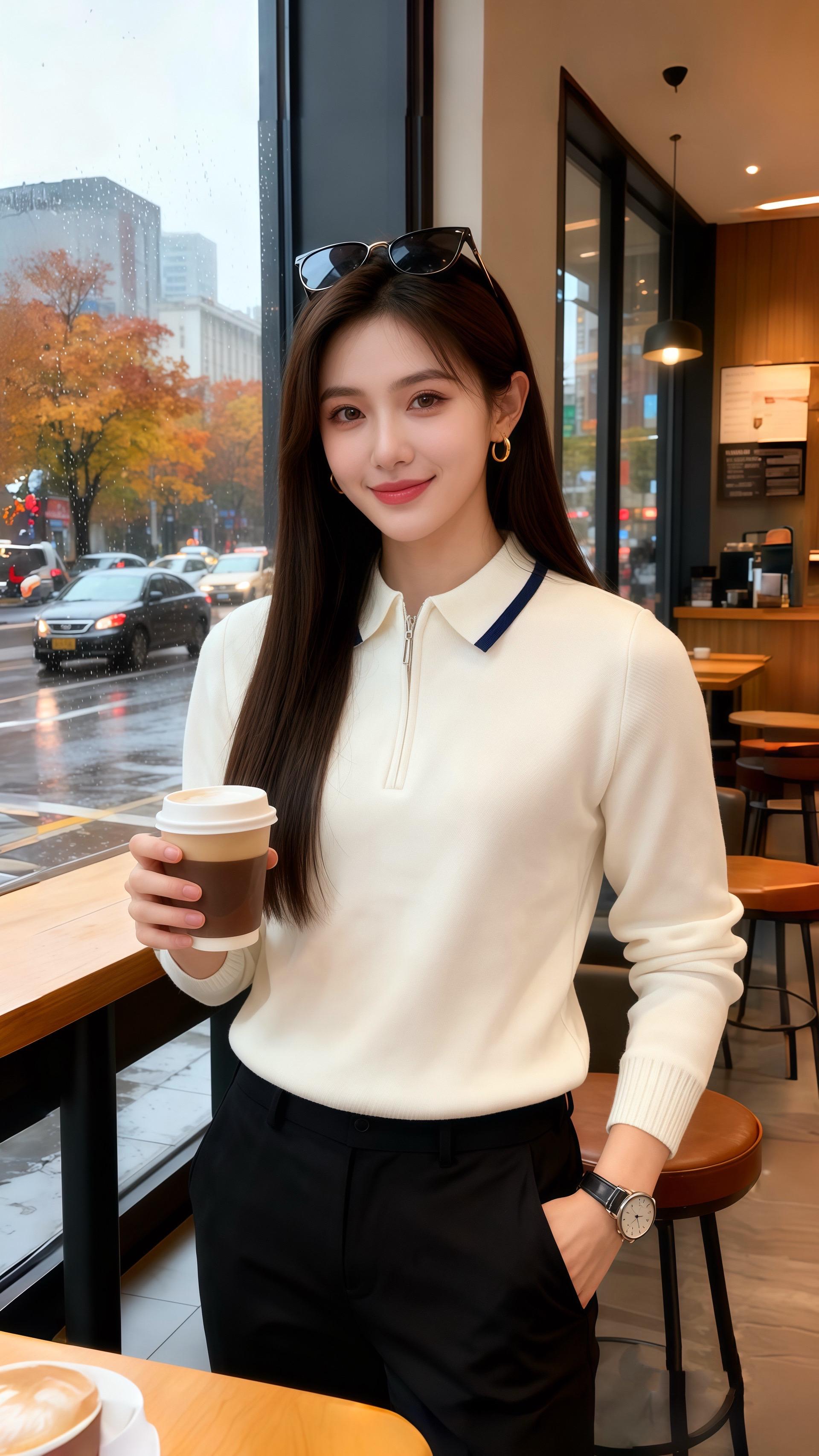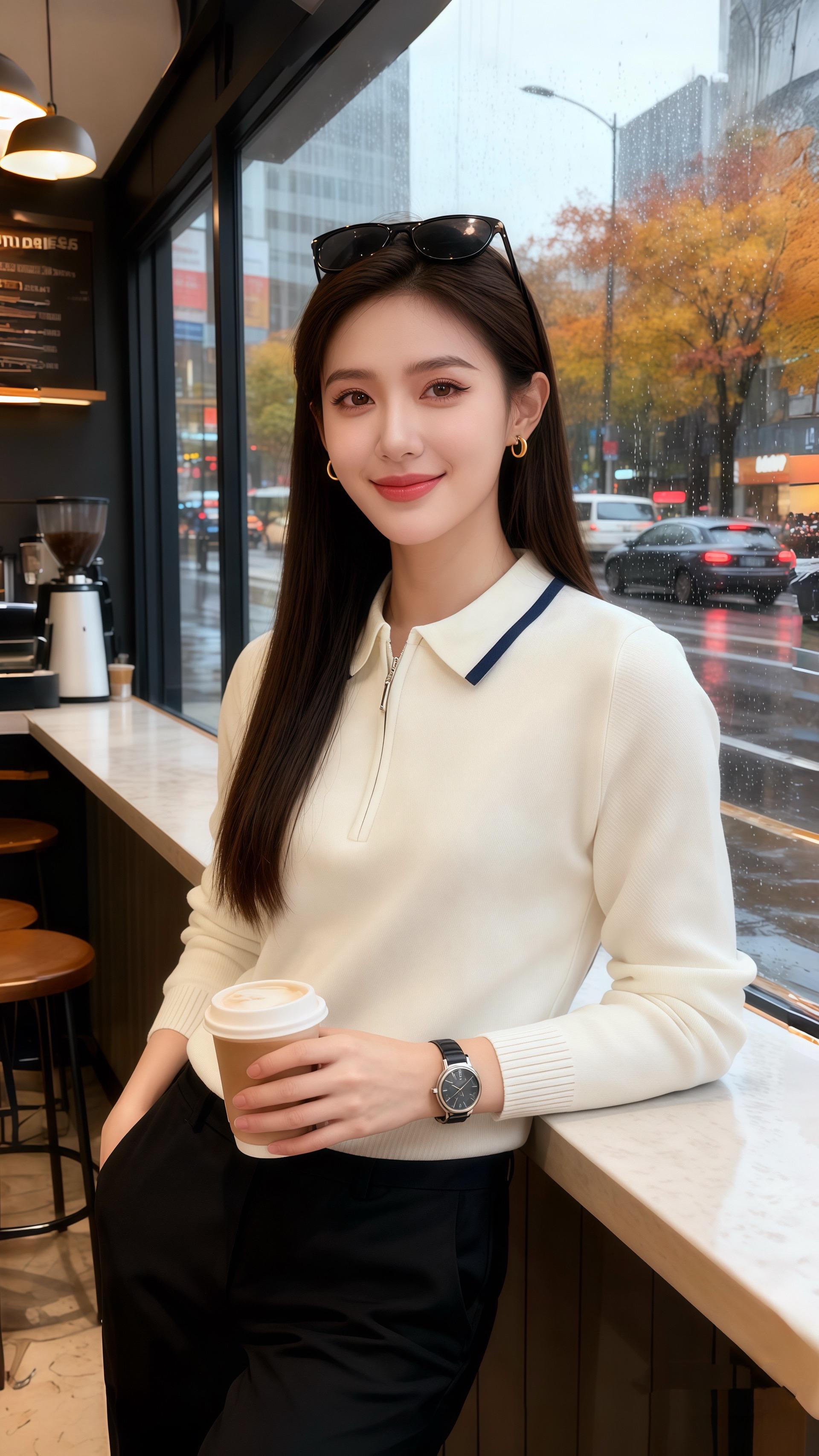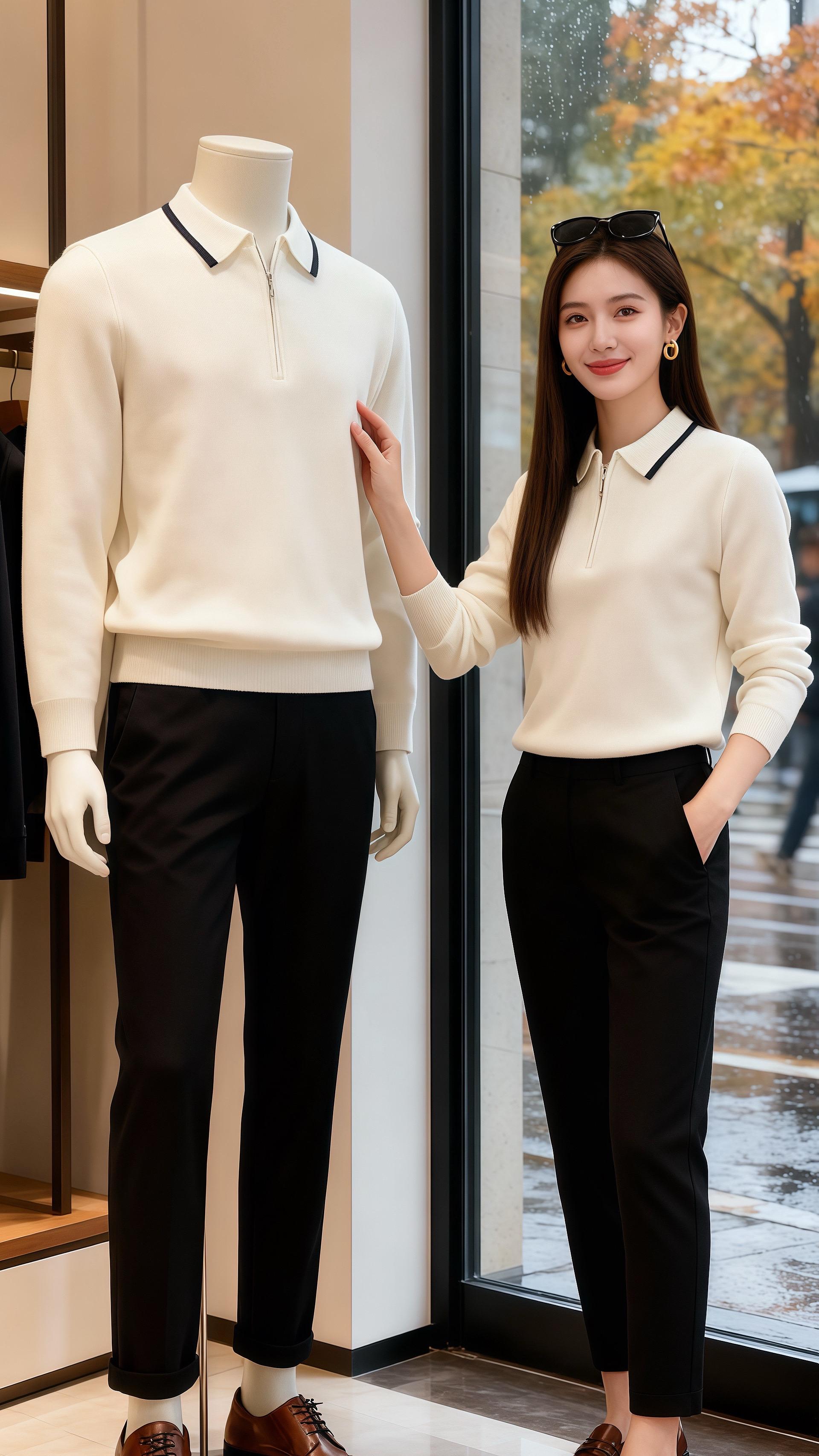 雨雾漫过落地窗时,林柚正穿那件奶白翻领衫——藏青滚边勾出颈线,半开的拉链松得刚好,像秋阳浸软的云。