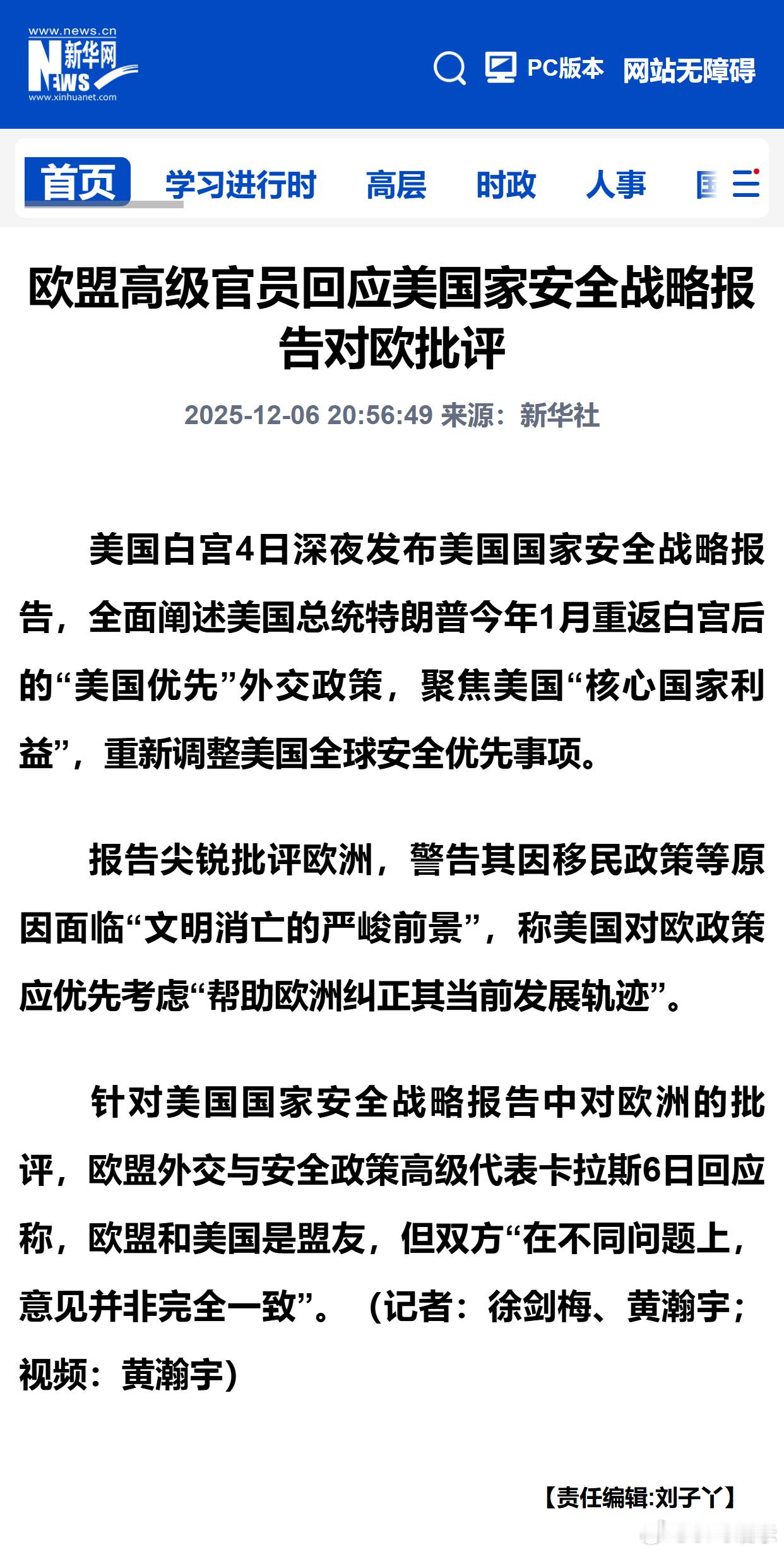 特朗普公布新国安战略,欧洲震动,德国外交发言人,谴责美国干涉欧盟内政。此前对华强