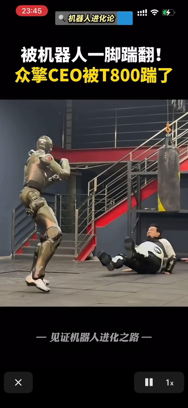 机器人进化论:被机器人一脚踹翻!众擎CEO被T800踹了。 众擎CEO体验T800格斗,见证机器人进化之路。被一脚踹翻在地,员工都笑的绷不住了。太残暴了,刚才踢到那脚其实如果不戴护具没人能承受得住。再看一遍无情铁脚。期待众擎T800机器人格斗赛!众擎CEO体验T800格斗。
