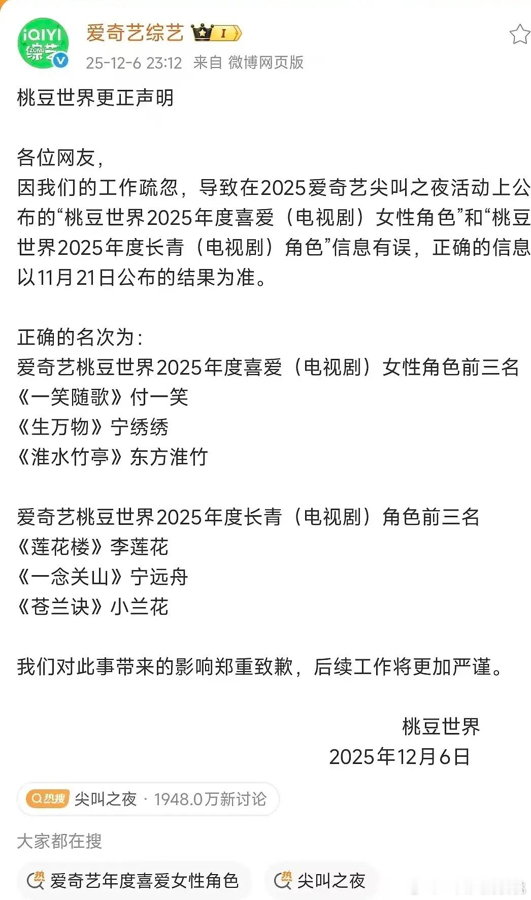 爱奇艺道歉把粉丝花钱投岀来的刘诗诗的角色换成了白鹿的,排名顺序也错了