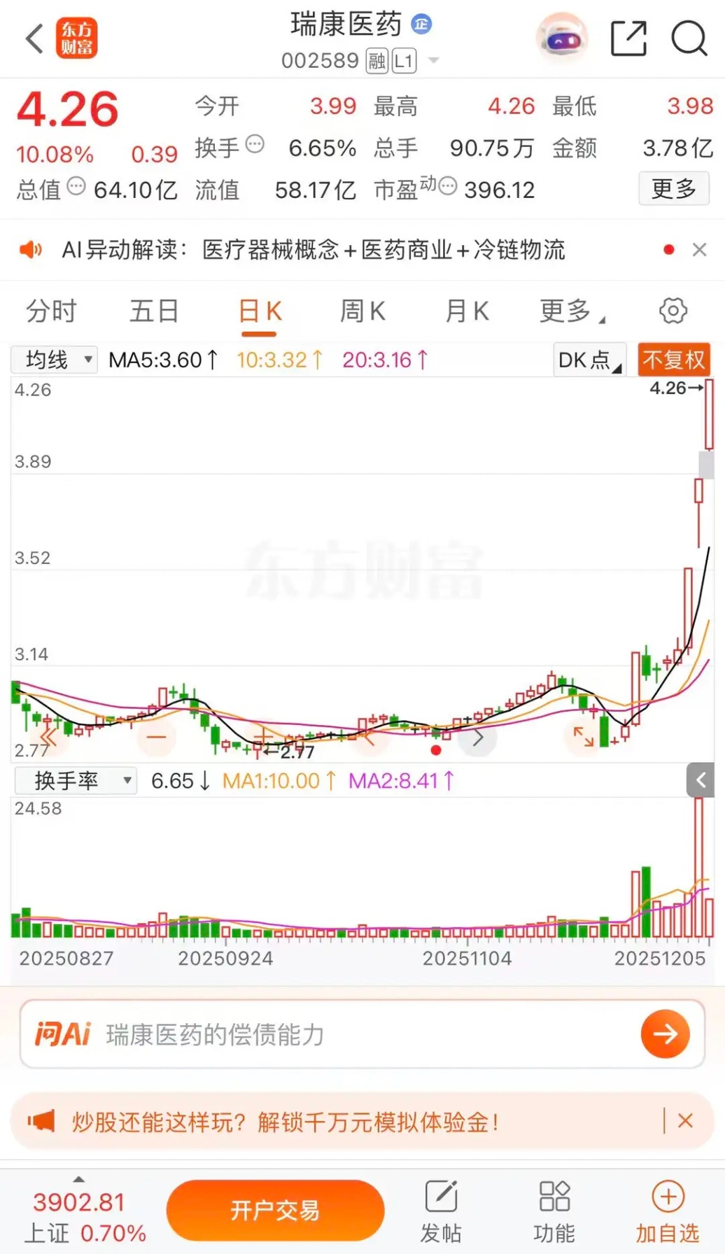 国风新材,瑞康医药,国机重装,低价有妖股,那个更有机会瑞康医药涨停板收盘报收4.26元每股,成交金额3.78亿元,8天4涨停板。国风新材涨停板收盘报收9.13元每股。成交金额7.65亿元,市值达到百亿应该不是梦。国机重装涨停板收盘报收4.63元每股,连续3天涨停板,成交金额24.87亿元。更看好瑞康医药,因为海王生物龙头,节奏接下。