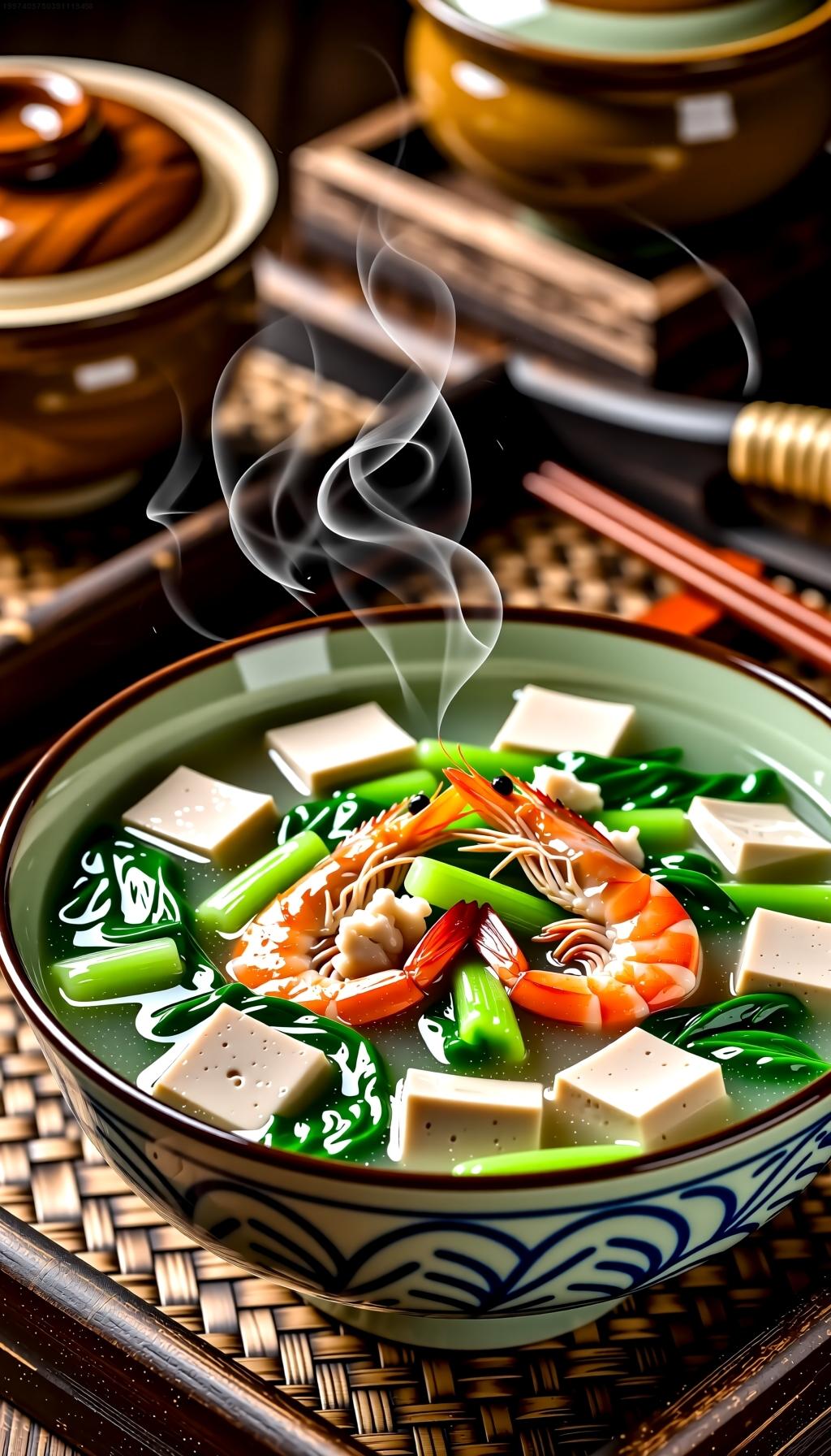 一碗热气腾腾的白菜豆腐三鲜汤,清澈透明的汤底中漂浮着嫩滑的豆腐块,翠绿的白菜叶片轻盈飘舞,鲜美的三鲜(虾仁、鱼片、鸡肉)点缀其间,汤面上泛着细腻的油光,背景是古色古香的陶瓷碗和木质餐桌,散发出温暖而诱人的家庭氛围,细腻的蒸汽升腾而起,令人垂涎欲滴。