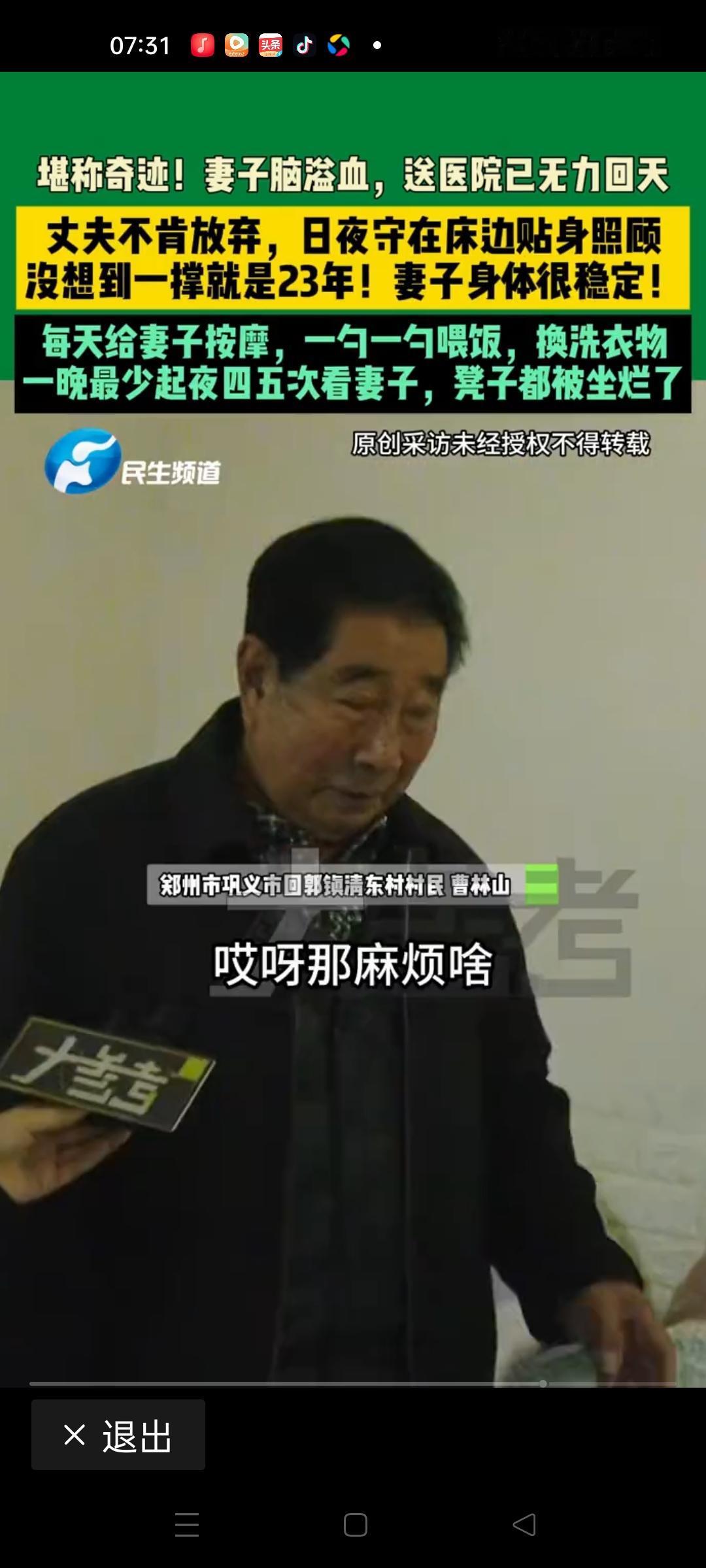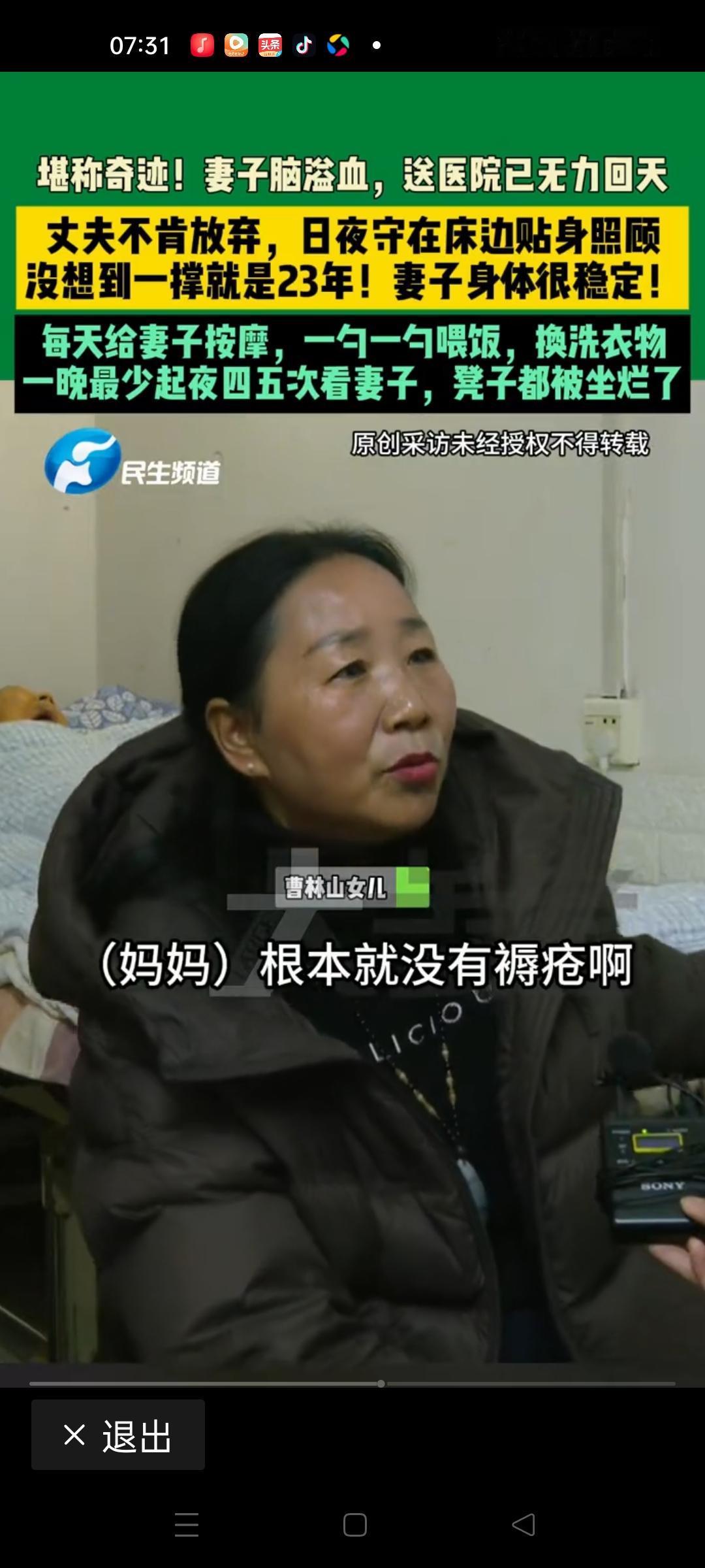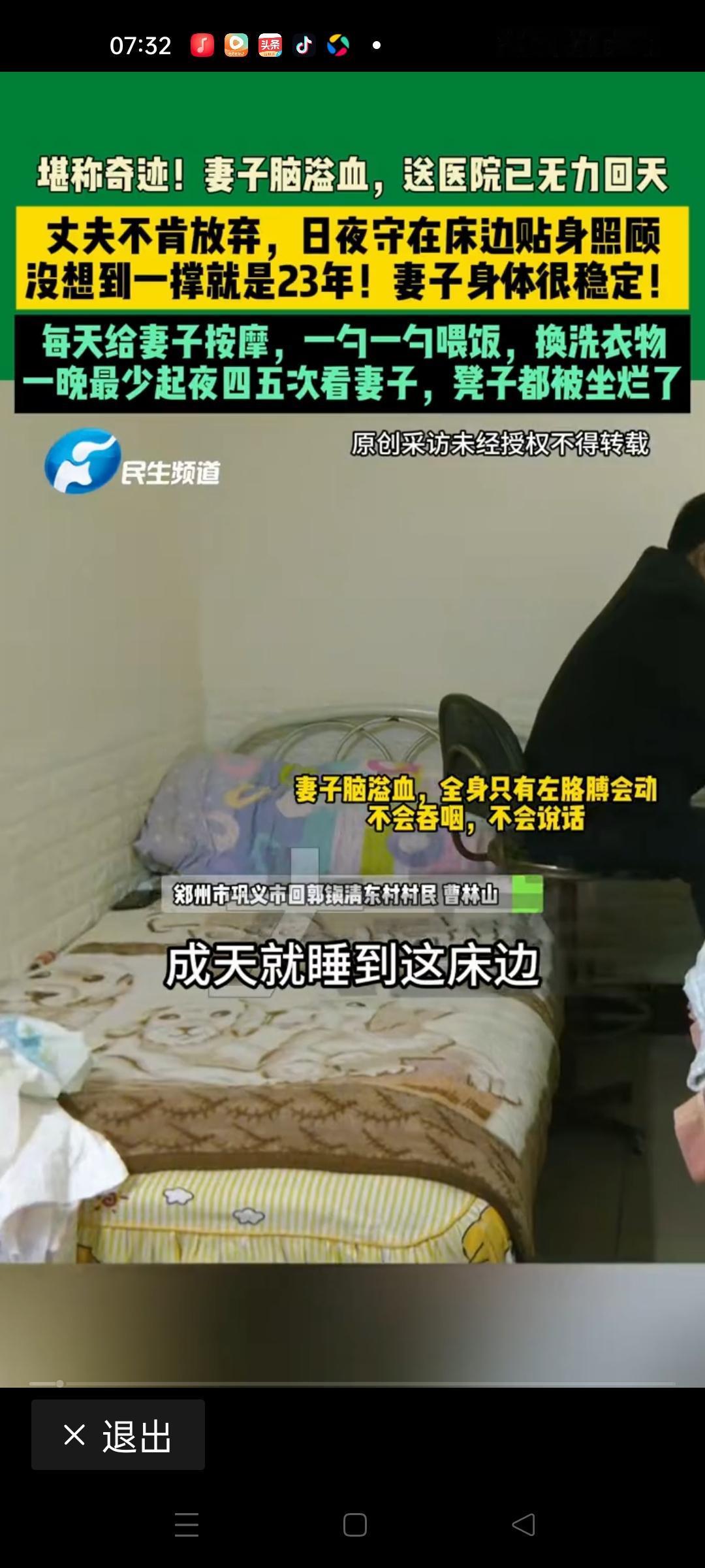 在这个快节奏、充满压力的时代,有多少人愿意用一生去守护一份承诺?今天的故事,或许会让你重新审视“爱”的定义。23年前,一场突如其来的脑溢血,打破了这个家庭的平静,也让丈夫的生命轨迹发生了天翻地覆的改变。 那是一个普通的早晨,妻子突然晕倒在厨房里,丈夫在慌乱中第一时间将她送到医院。医生的诊断如晴天霹雳——脑溢血,生命垂危。面对突如其来的变故,很多人可能会选择放弃,或是感到绝望,但他没有。他用尽所有的力气,守在妻子身边,日夜照料,像一个坚不可摧的守护天使。 23年过去了,妻子依然躺在病床上,行动几乎靠轮椅,言语也变得含糊不清。而他,却从未有一刻离开过。无数个深夜,他为她翻身、喂饭、擦拭,每一滴汗水都饱含着深沉的爱。有人说:“这样的爱,太沉重了。”但他笑着说:“只要她还能感受到我在,她就有力量。” 这份坚守,超越了普通的亲情,更像是一场无声的誓言。有人或许会问:“这么多年的付出,值得吗?”答案或许因人而异,但在他心中,没有“值得”与“不值得”。他只知道,他的生命,就是为了守护她的那一刻。 这故事引发了无数人的共鸣:在这个世界上,最动人的爱,或许就是在平凡中坚持不懈的陪伴。它让我们相信,爱不是轰轰烈烈的誓言,而是日复一日、点点滴滴的守候。每一个默默付出的背后,都藏着一份不变的初心——那就是,无论风雨,始终如一。 或许我们都在追求梦想、追求成功,但在某个角落,有人默默守护着一个人,用一生去书写最真实、最动人的爱情篇章。这份爱,没有轰轰烈烈的高潮,却温暖了无数人的心。它告诉我们:爱,不一定要轰轰烈烈,但一定要真心实意。 你是否也被这份坚守感动?或许,你也会在平凡中找到属于自己的那份不变的爱。因为,真正的爱,从来都不是一瞬间的火花,而是日复一日的守候与陪伴。让我们为那些默默付出、无私奉献的人点赞,也希望每个人都能在自己的生活中,找到那份坚持到底的力量。丈夫照顾妻子23年