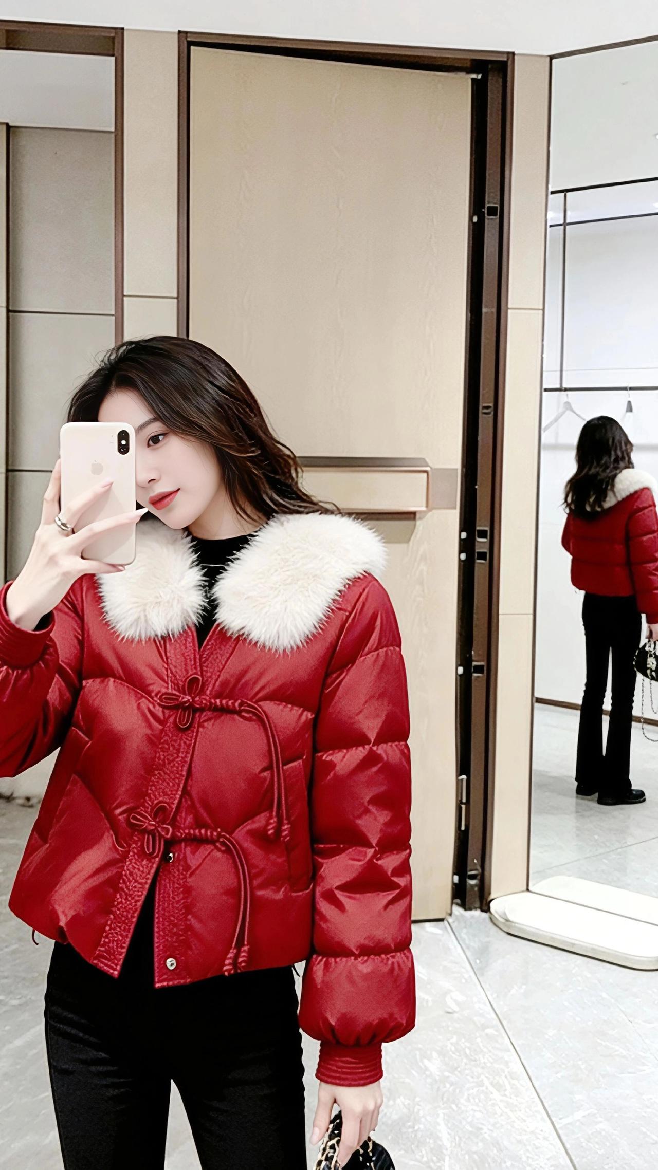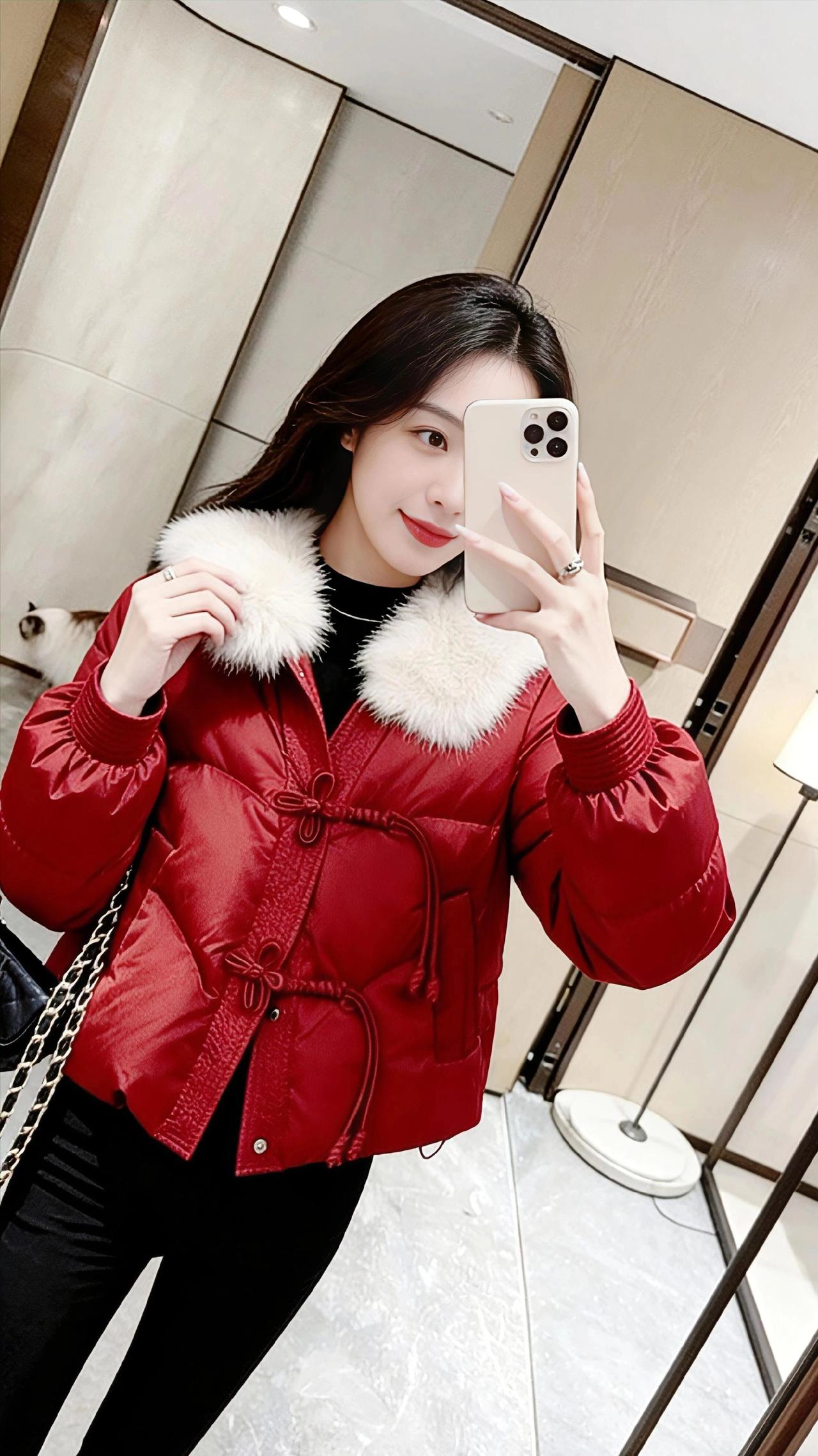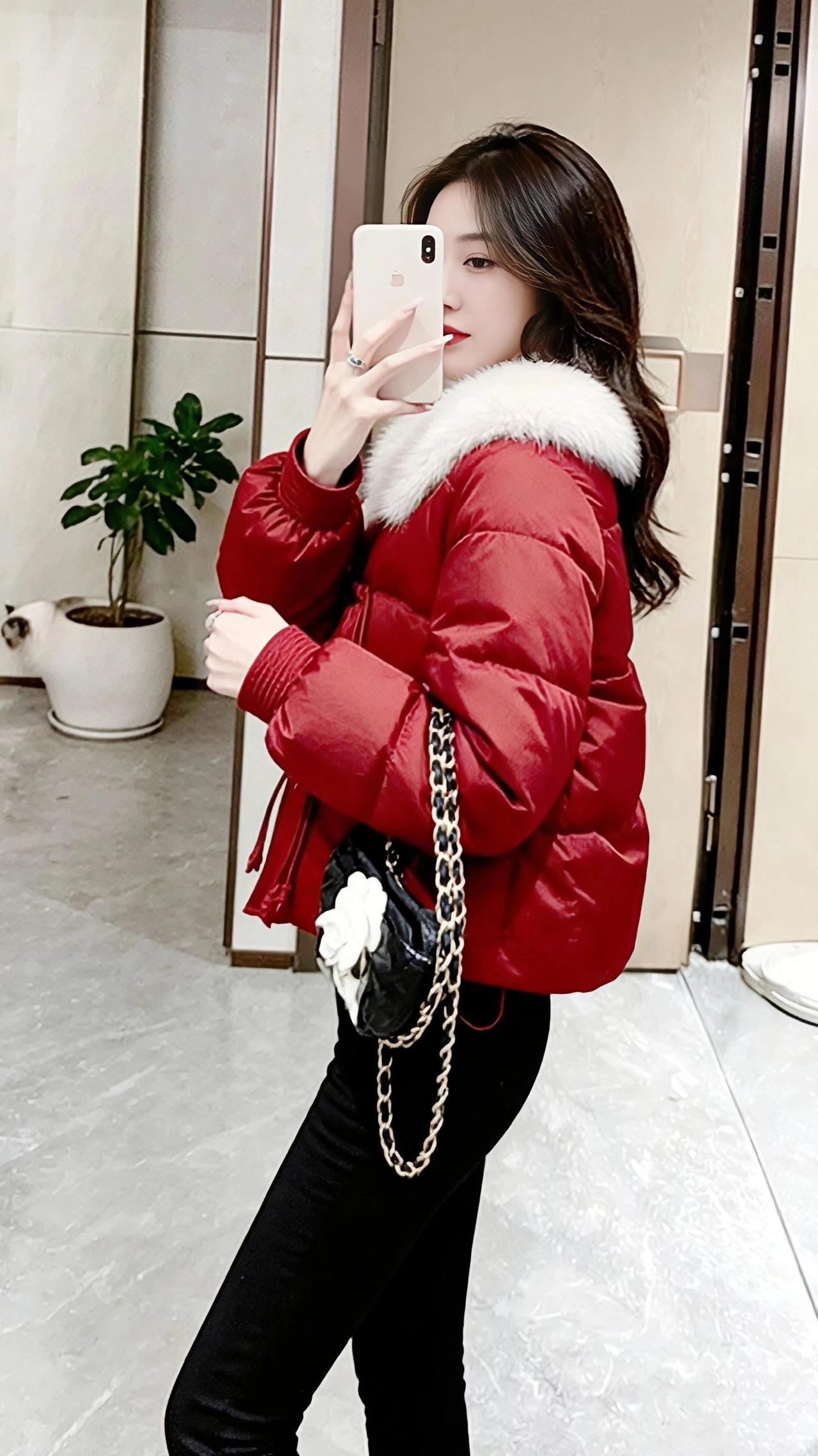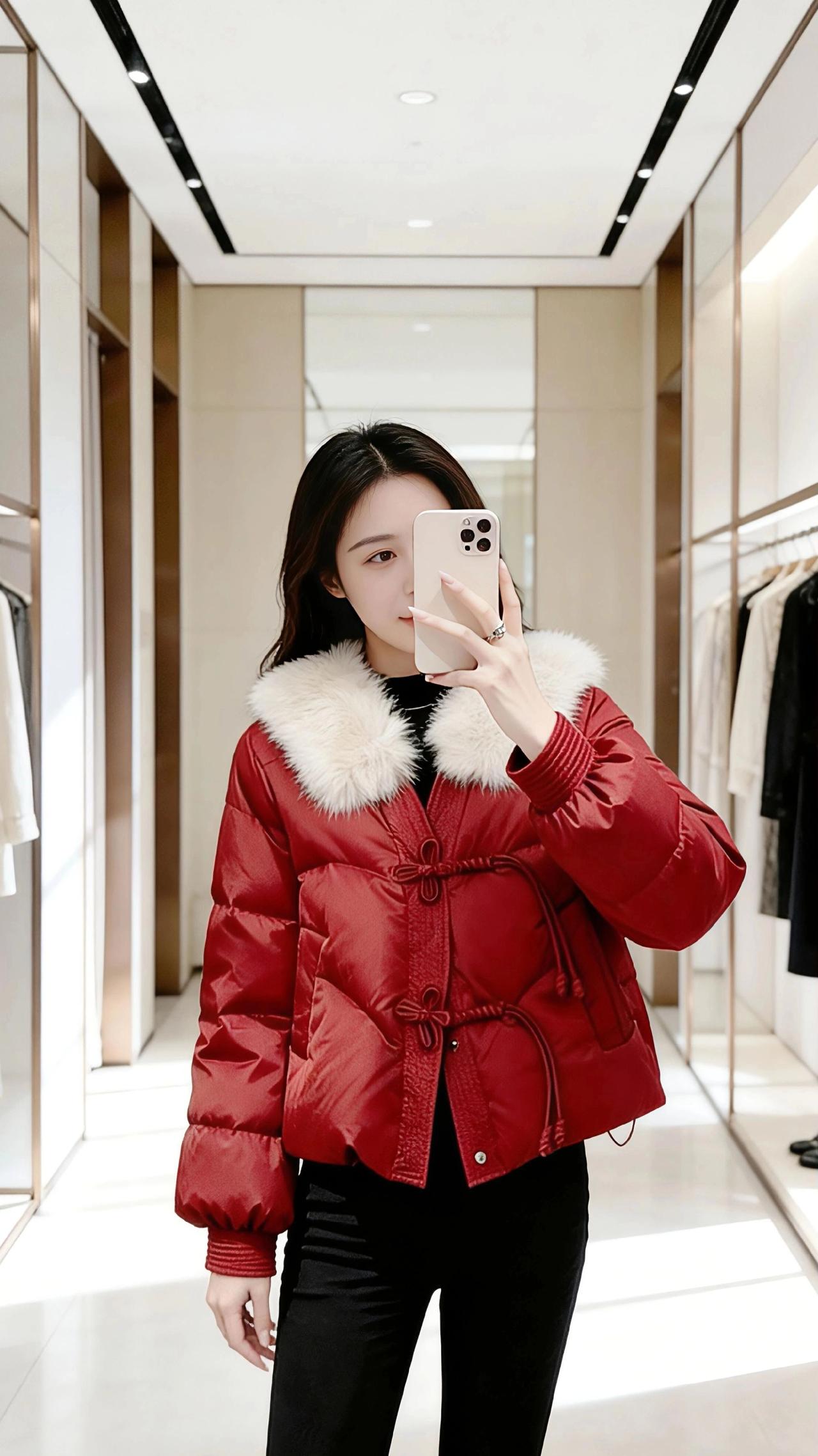 她把镜头凑得近了些,红羽绒服的光泽裹着软乎乎的毛领,像浸了糖霜的浆果,在暖光里泛着甜。 镜面墙把身影叠成温柔的影,手机屏幕映着她弯起的眼——毛领蹭过发梢时,连风都慢下来。黑裙的褶皱裹着碎光,链条包垂在腕间,像串轻晃的星。 后来她转身,衣摆扫过镜面的刹那,红与白的软绒,和镜里的自己撞成一帧暖。连空气都浸了点甜,是冬衣裹住的、恰好的温度。 高级感穿搭 小个子穿搭 新年穿搭 外套穿搭