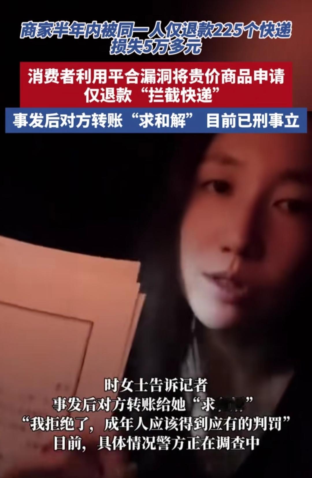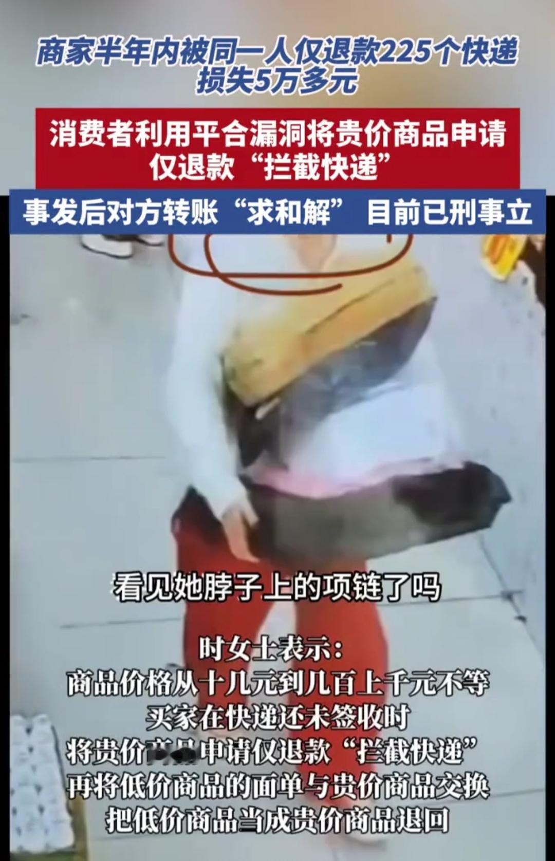 谁能想到有人把“仅退款”玩成了“职业诈骗流水线”?广州时女士半年被同一买家恶意操作225次,贵价商品被“拦截快递”后调包成低价货退回,直接亏了5万多——这操作精得像开了外挂! 更离谱的是,这人不光薅羊毛,还把骗来的东西挂二手平台卖,甚至打造“富婆人设”炫富,朋友圈喊着“你们搬砖我搬钱”。等东窗事发,又装可怜说“老公去世带孩子”求和解,转头就转账想私了,这脸皮厚度我是真服了。 仓库天天收退回件,谁能想到面单底下全是“偷梁换柱”?这哪是占便宜,分明是把商家当自动取款机!现在案子已经刑事立案,只能说:出来薅,迟早要还的。