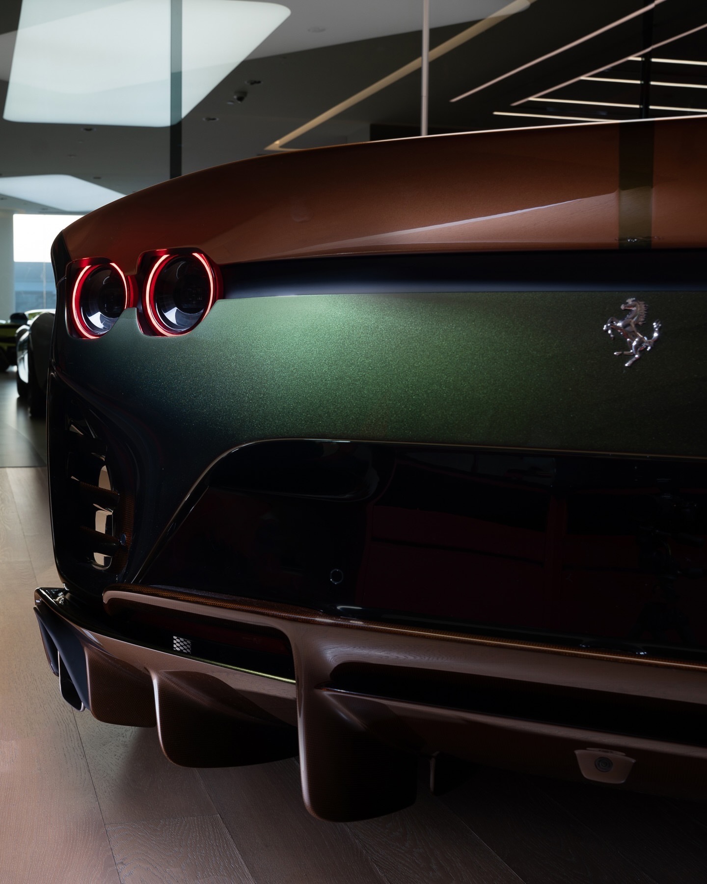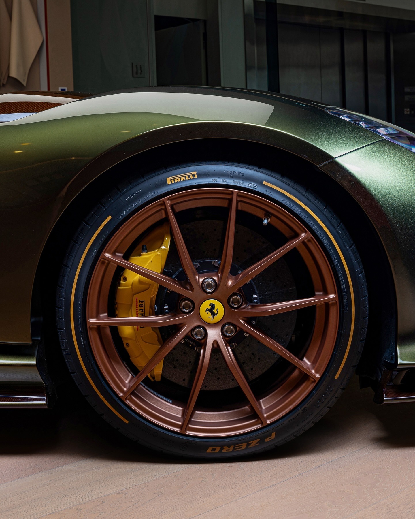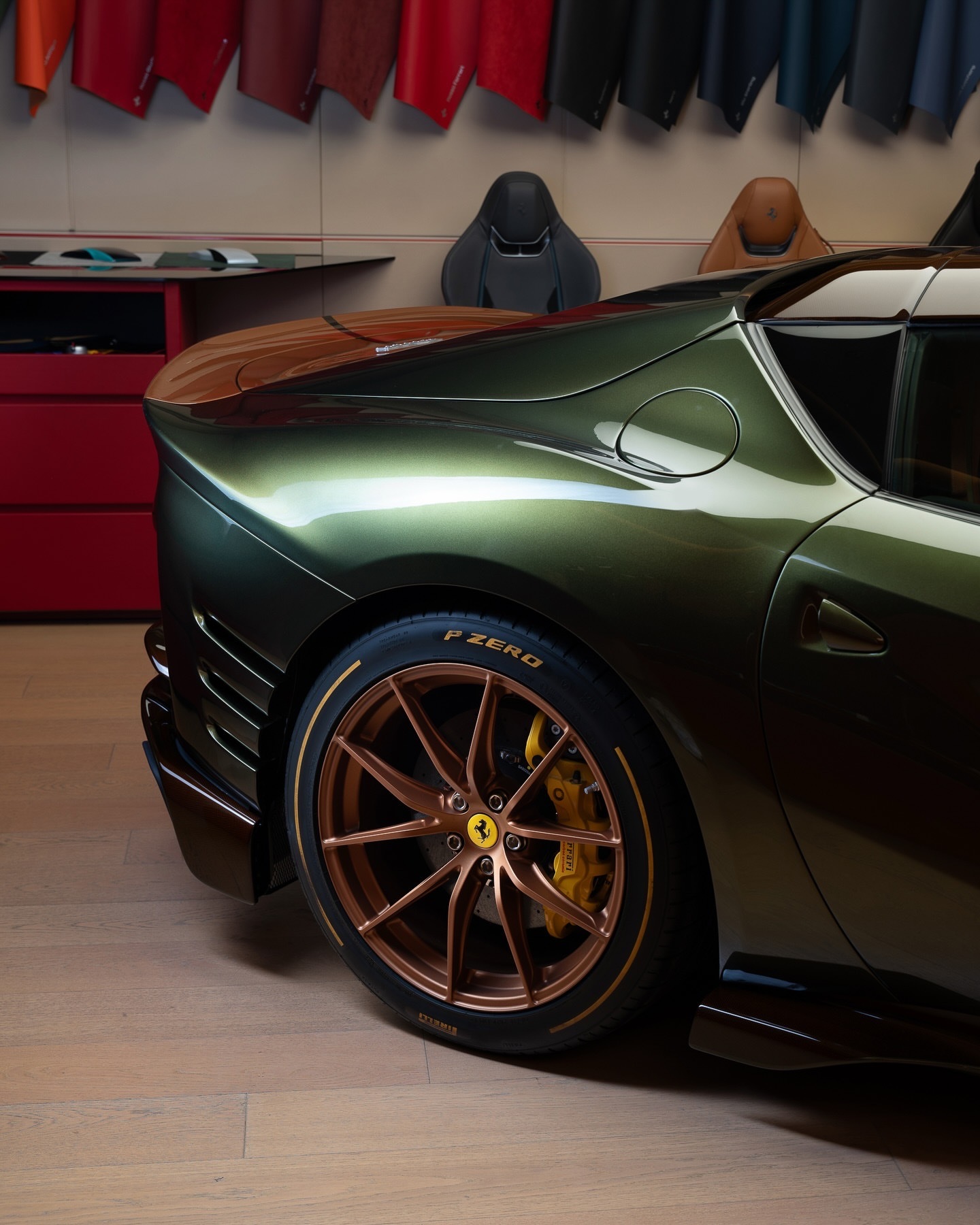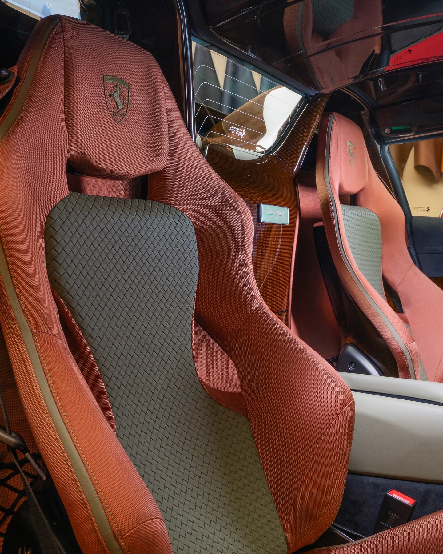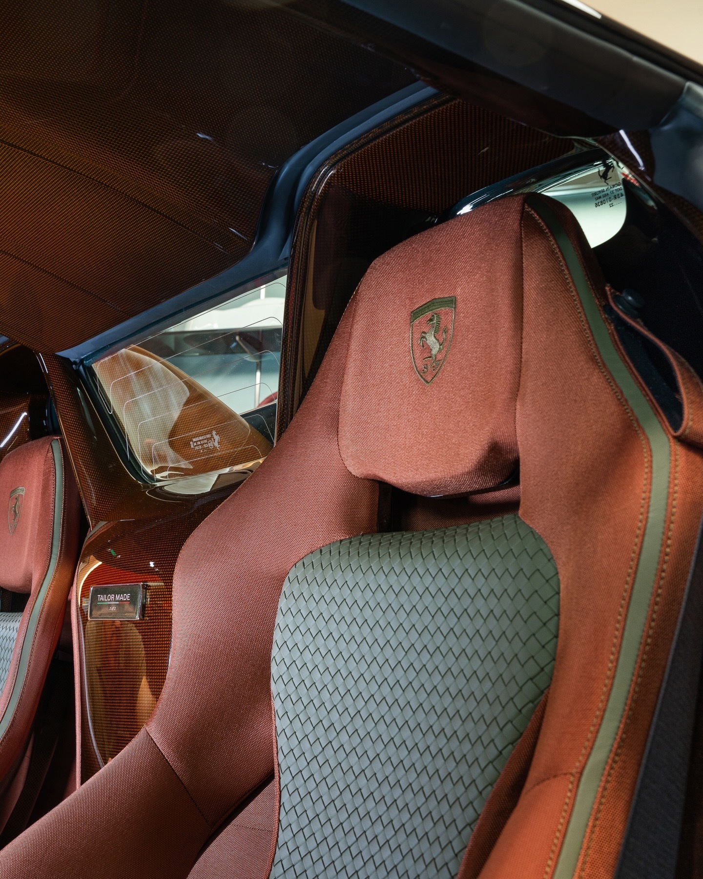每台法拉利TailorMade车型都捕捉到了独特的灵魂,而812CompetizioneA则将赛道准备性能与无可妥协的风格融为一体。其Verde Volterra车身设计通过Bronzo Cordura涂装和Marrone Lucido棕色碳纤维得以突出。车内,座舱散发出动感的优雅。Bronzo Codura框架碳纤维赛车座椅采用Woven Palude家具皮革制成,并配有Marrone Lucido棕色碳纤维插片。法拉利812豪车超跑老纪侃车