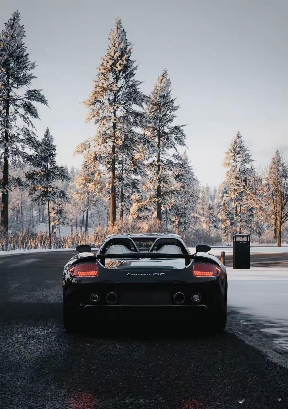 保时捷Carrera GT,尾部有“Carrera GT”专属标识,尾灯为标志性红色条状设计,底部配备四出排气管。2003-2007年间限量生产1270台,采用中置后驱布局,车身为碳纤维复合材料,搭载5.7L V10自然吸气发动机,最大功率550马力,零百加速约3.9秒,最高时速330km/h。