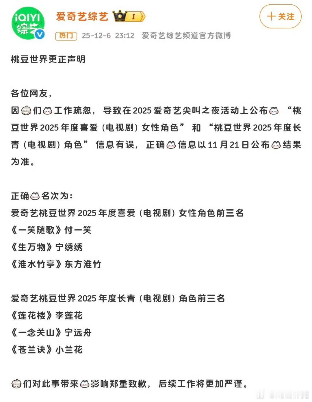 爱奇艺道歉把粉丝花钱投岀来的刘诗诗的角色换成了白鹿的,排名顺序也错了
