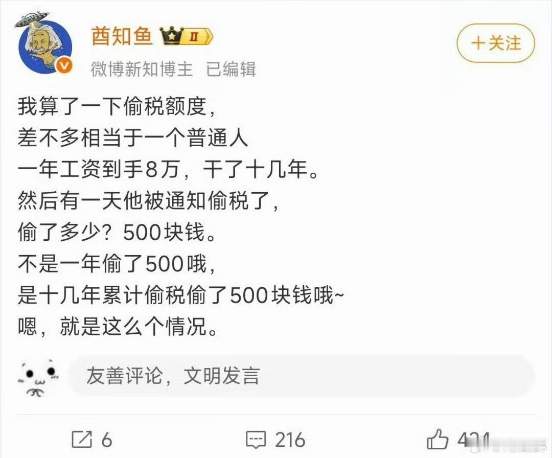 按这个逻辑,等比换算一下,马斯克偷税 10 个亿都不算事儿。能力越大,责任越小呗?拳王泰森跟你吵架,打起来了,一拳把你打成脑震荡,也不用负任何责任。因为他根本没使劲,只出了 5% 的功力,差不多相当于普通人轻轻抚摸了你一下~嗯,就是这么个情况。