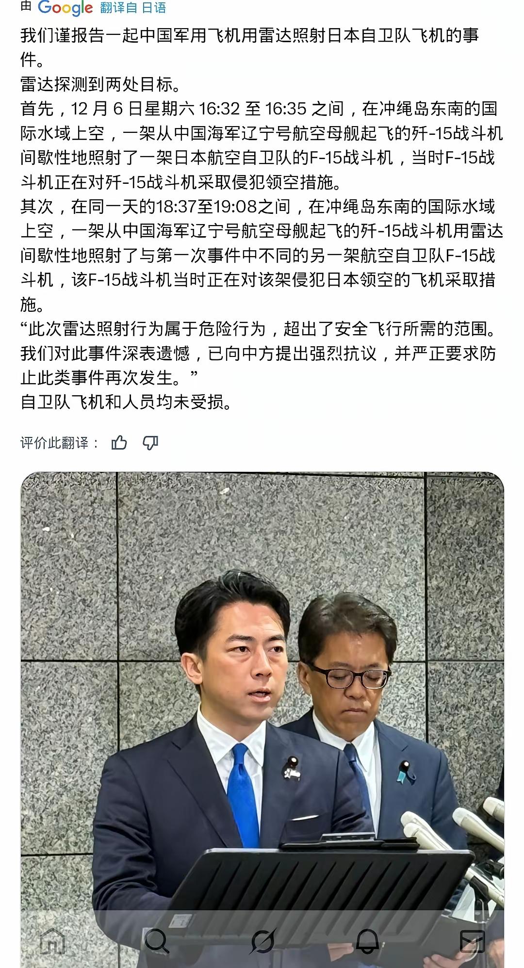 急了,小八嘎急了。它们的F15被我们辽宁舰上的歼15用雷达照了。 丢人不? 广场上一个摸包贼被事主发现了,难道不应该自己装着若无其事地走开吗? 还闹得全世界都知道你在偷东西被抓住了。 这次只是抓住,直接让你滚蛋,没有揍你。 下次可就不一定了哦。 没事少来招惹我。 顺便说一句,这次是宫古海峡,下次我们有可能出现在东京湾哦,你要是还是敢靠近,我们还会用雷达照你。 那个时候你该怎么办?换个人来抗议吗?[奸笑] 点右上角关注我,我们一起去看这个魔幻的世界