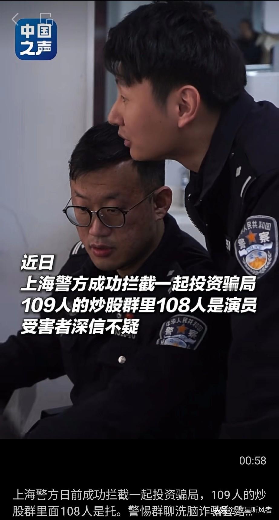 “109人”的炒股群,竟有108个托?!老人10万积蓄险被骗 “109人”的投资精英群,108个都是“演员”!近日,上海一位老人被拉入一个名为“创投精英汇”的炒股群,群内“大师”每日荐股,“群友”频频晒出“赚钱捷报”,营造出热火朝天的投资氛围。在一份伪造的上市公司PPT和“稳赚20%以上”的承诺诱惑下,老人深信自己“中了新股”,赶往银行欲向陌生账户转账10万元认购。所幸银行察觉有异并报警,民警火速赶到现场劝阻。 经警方核查,这个看似拥有109名成员的“高端”群聊,竟有108个账号都是诈骗分子伪装的“托”。所谓即将上市的公司PPT粗糙伪造,投资软件所属公司也毫无金融资质。假专家、假群友、假捷报相互配合,演绎了一出专门围猎受害者的“精密剧本”。 典型的“围猎式”投资骗局。诈骗团伙利用人性弱点,通过搭建“信息茧房”进行洗脑: 1. “氛围组”洗脑:海量“托儿”在群内扮演不同角色,制造“很多人都在赚钱”的从众假象,瓦解受害者理性判断。 2. “权威”背书:伪造文件、冒用真实公司信息,甚至利用可查的公开信息“掺真造假”,极具迷惑性。 3. “稀缺”诱惑:以“中新股”、“内部名额”、“最后时限”等话术,制造紧迫感,促使受害者匆忙转账。 年关将至,各类投资理财诈骗进入高发期。此类骗局往往针对有一定积蓄、渴望资产增值但信息辨别力较弱的中老年群体。警方再次提醒:所有承诺“稳赚不赔”、“超高回报”的投资都是诈骗。 投资理财请务必通过正规金融机构,切勿轻信陌生网友、点击不明链接或下载来路不明的APP。 诈骗剧本不断翻新,但核心套路无非是利用人性的贪念与焦虑。对此你怎么看?你或身边人是否遇到过类似“影帝级”的骗局?欢迎在评论区分享你的见解或经历,提醒更多人。
