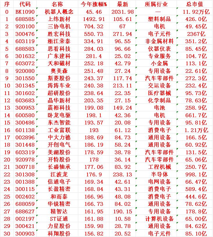 机器人概念,2025年以来涨幅最多的30名单 上纬新材:今年涨幅+1492.