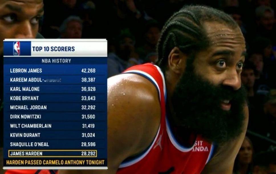 哈登距离历史第九位的奥尼尔还差306分!哈登