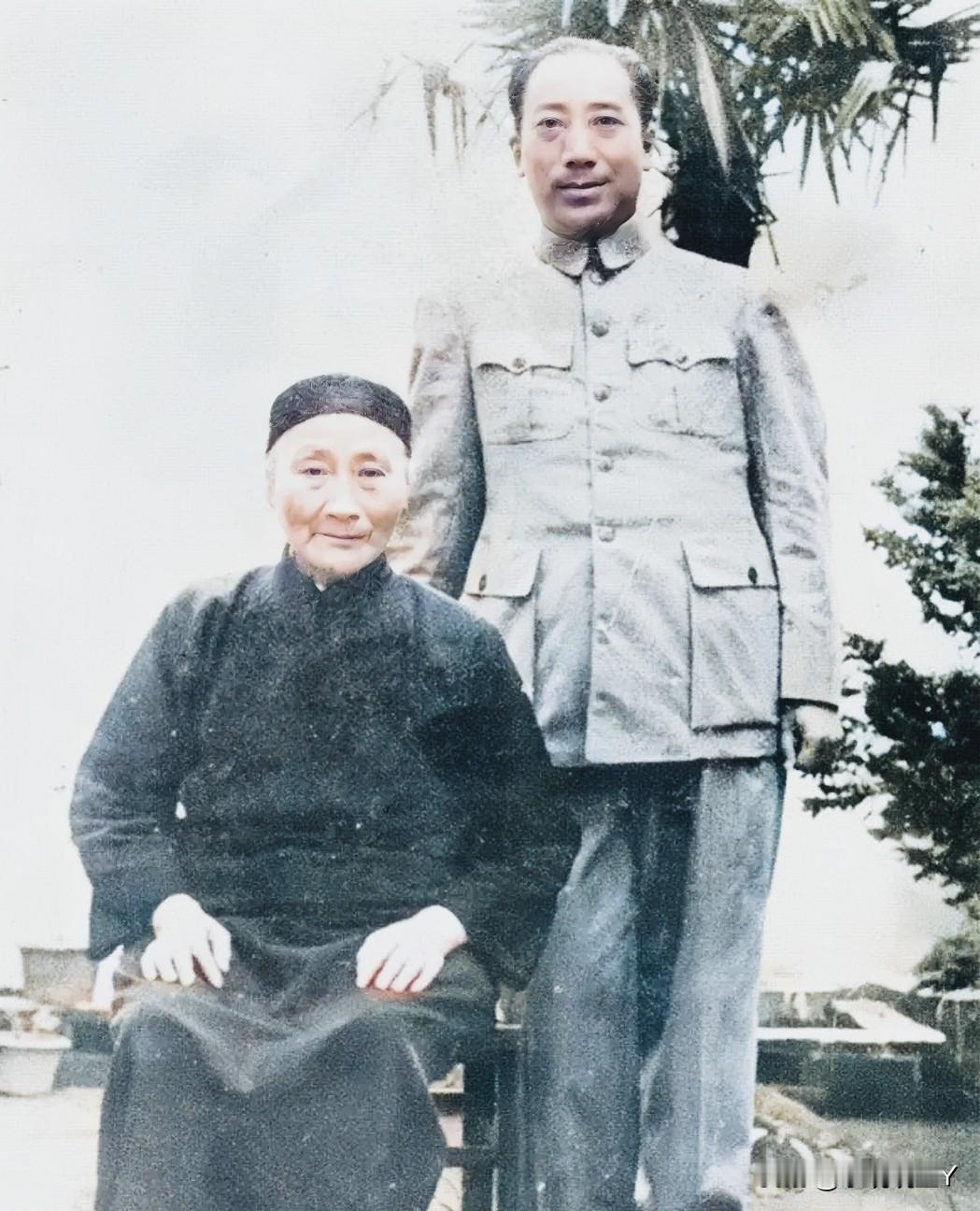 一九四五年,在重庆梅花山别墅前院子里的军统副局长戴笠与他母亲蓝月喜。彼时戴笠48岁,在母亲面前展现出难得的温和与孝顺