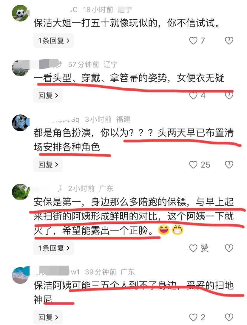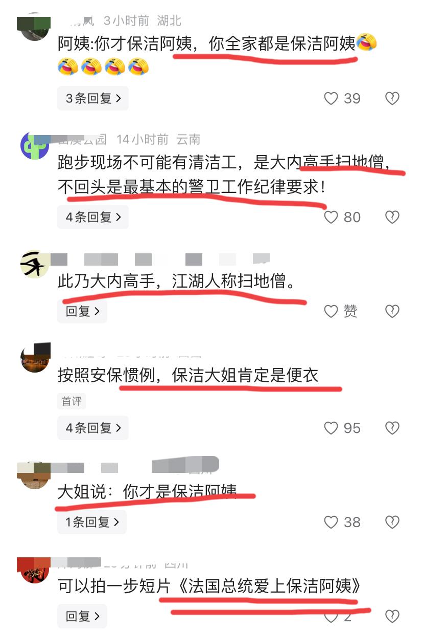 12月5日法国总统马克龙成都跑步,网友说“保洁大姐”见了总统“头也不回”,酷毙了。要我说啊,2种可能: 1、90%:保洁大姐是在扫地,但应该是“警卫人员”中的扫地僧。 2、10%:保洁大姐更关心1800元月薪的工作完成了没有,搞不好被扣钱,一家老小呢。总统?不认识、不感兴趣、没有我领导凶(他发不了奖金扣不了钱)。 看看网友的热评,好玩着呢~[捂脸]你认为那种可能性更高?