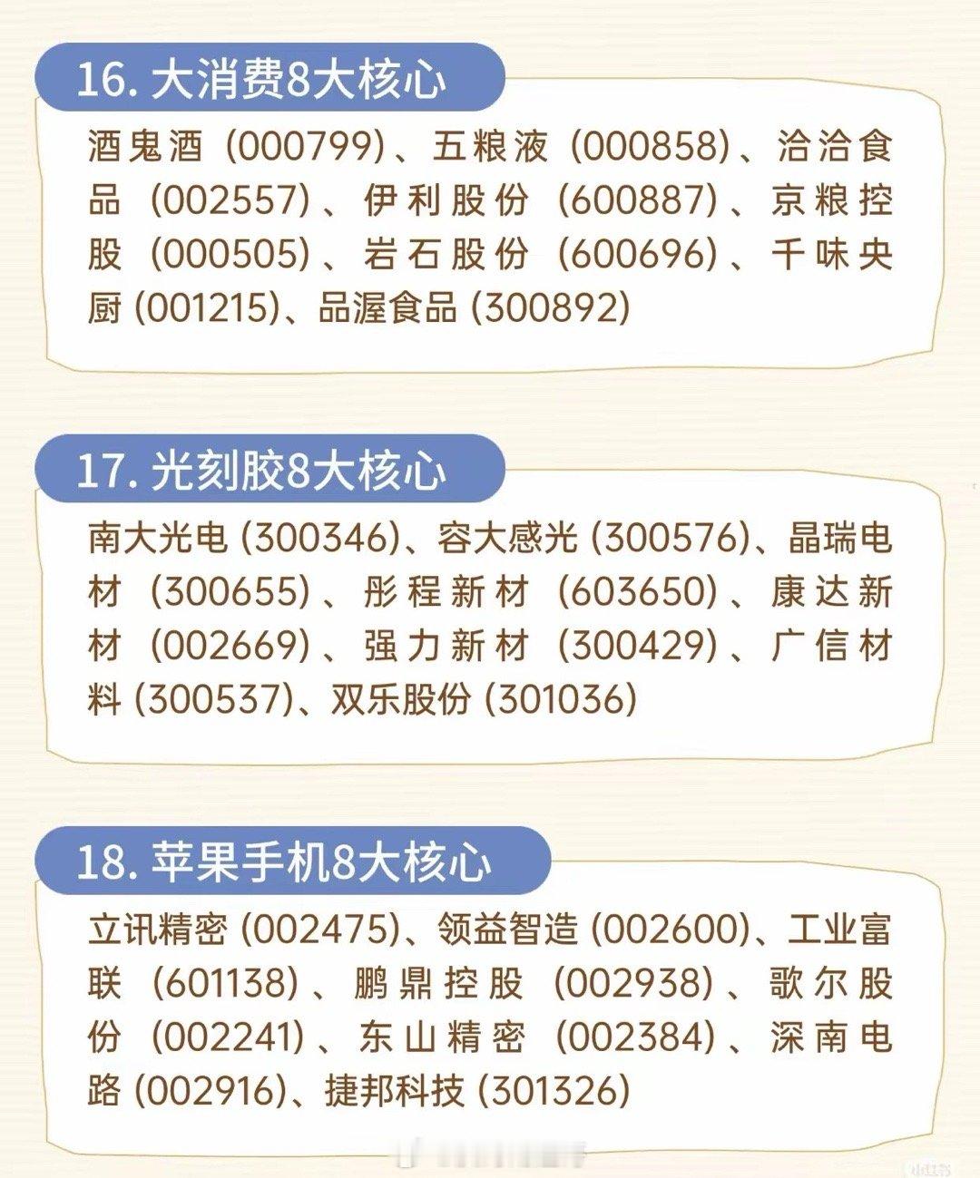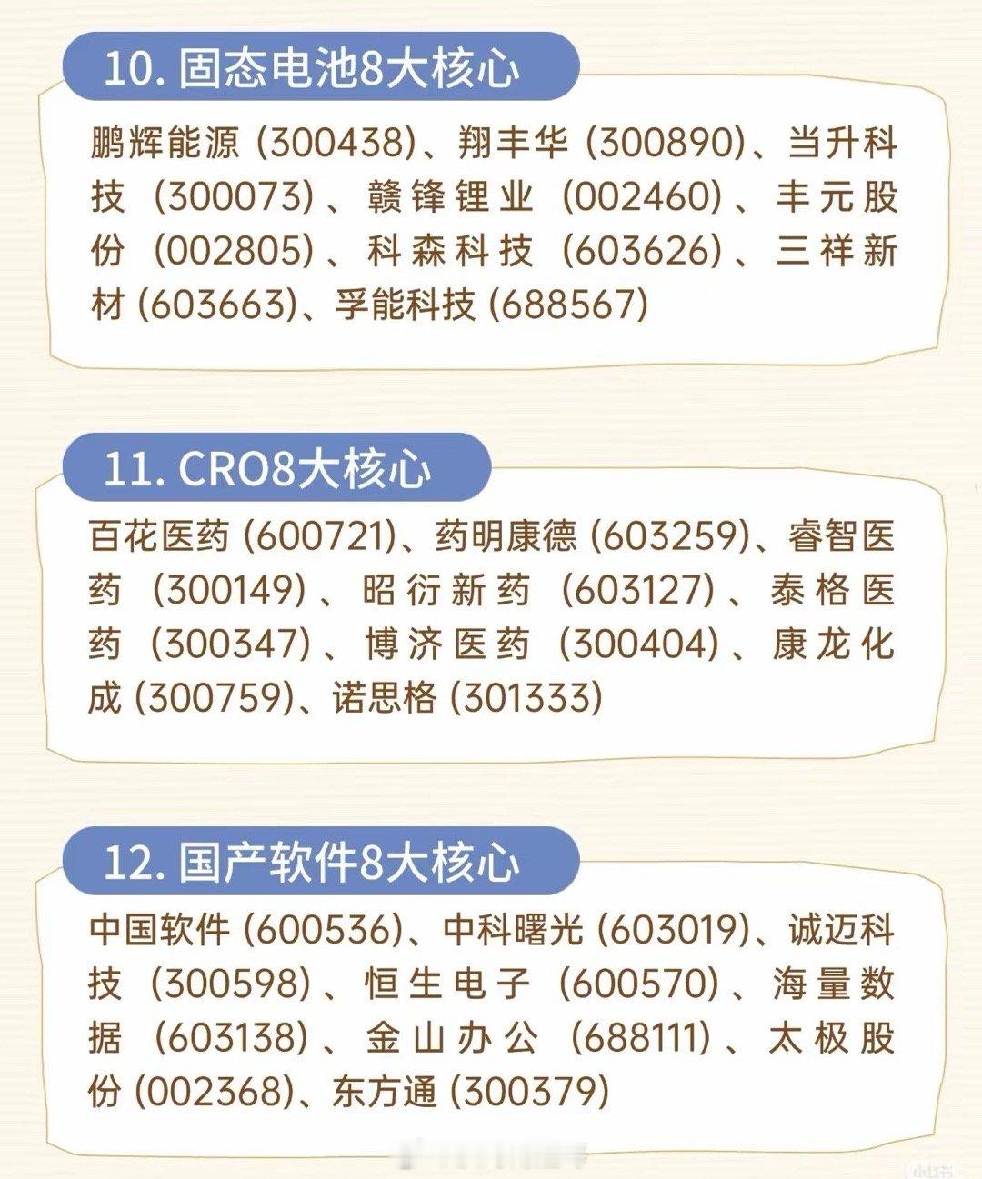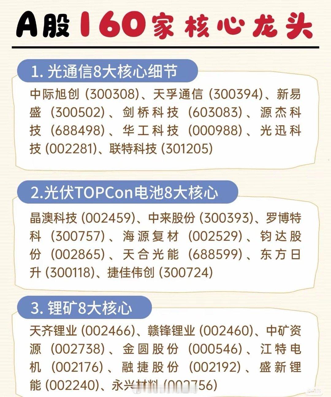A股160家核心龙头股票:光通信8大核心,包含中际旭创(300308)、天孚通信(300394)、新易盛(300502)、剑桥科技(603083)、源杰科技(688498)、华工科技(000988)、光迅科技(002281)、联特科技(301205);光伏TOPCon电池8大核心有晶澳科技(002459)、中来股份(300393)、罗博特科(300757)、海源复材(002529)、钧达股份(002865)、天合光能(688599)、东方日升(300118)、捷佳伟创(300724);锂矿8大核心涵盖天齐锂业(002466)、赣锋锂业(002460)、中矿资源(002738)、金圆股份(000546)、江特电机(002176)、融捷股份(002192)、盛新锂能(002240)、永兴材料(002756)。AI算力8大核心,包括浪潮信息(000977)、中兴通讯(000063)、工业富联(601138)、中科曙光(603019)、海光信息(688041)、寒武纪(688256)、紫光股份(000938)、胜宏科技(300476);移动支付8大核心有信雅达(600571)、飞天诚信(300386)、御银股份(002177)、恒宝股份(002104)、仁东控股(002647)、创识科技(300941)、新国都(300130)、翠微股份(603123);医药商业8大核心包含老百姓(603883)、开开实业(600272)、漱玉平民(301017)、人民同泰(600829)、润达医疗(603108)、合富中国(603122)、健之佳(605266)、百洋医药(301015)。无线耳机8大核心,涉及歌尔股份(002241)、力源信息(300184)、立讯精密(002475)、韦尔股份(603501)、恒玄科技(688608)、漫步者(002351)、瀛通通讯(002861)、鹏鼎控股(002938);华为产业链8大核心有深圳华强(000062)、力源信息(300184)、常山北明(000158)、拓维信息(002261)、润和软件(300339)、软通动力(301236)、四川长虹(600839)、赛力斯(601127);小金属8大核心包含云南锗业(002428)、西部材料(002149)、中钨高新(000657)、华锡有色(600301)、宝钛股份(600456)、洛阳钼业(603993)、东方锆业(002167)、中矿资源(002738)。固态电池8大核心,包括鹏辉能源(300438)、翔丰华(300890)、当升科技(300073)、赣锋锂业(002460)、丰元股份(002805)、科森科技(603626)、三祥新材(603663)、孚能科技(688567);CRO8大核心有百花医药(600721)、药明康德(603259)、睿智医药(300149)、昭衍新药(603127)、泰格医药(300347)、博济医药(300404)、康龙化成(300759)、诺思格(301333);国产软件8大核心涵盖中国软件(600536)、中科曙光(603019)、诚迈科技(300598)、恒生电子(600570)。AI传媒8大核心包括中文在线(300364)、上海电影(601595)、中国出版(601949)、人民网(603000)、视觉中国(000681)、蓝色光标(300058)、汤姆猫(300459)、果麦文化(301052);华为昇腾8大核心有拓维信息(002261)、四川长虹(600839)、同方股份(600100)、润和软件(300339)、恒为科技(603496)、神州数码(000034)、天源迪科(300047)、亚康股份(301085);大消费8大核心,涉及酒鬼酒(000799)、五粮液(000858)、洽洽食品(002557)、伊利股份(600887)、京粮控股(000505)、岩石股份(600696)、千味央厨(001215)、品渥食品(300892);光刻胶8大核心有南大光电(300346)、容大感光(300576)、晶瑞电材(300655)、彤程新材(603650)、康达新材(002669)、强力新材(300429)、广信材料(300537)、双乐股份(301036);苹果手机8大核心包含立讯精密(002475)、领益智造(002600)、工业富联(601138)、鹏鼎控股(002938)、歌尔股份(002241)、东山精密(002384)、深南电路(002916)、捷邦科技(301326);AI医疗8大核心有润达医疗(603108)、阳普医疗(300030)、睿智医药(300149)、万达信息(300168)、贝瑞基因(000710)、朗玛信息(300288)、东软集团(600718)。