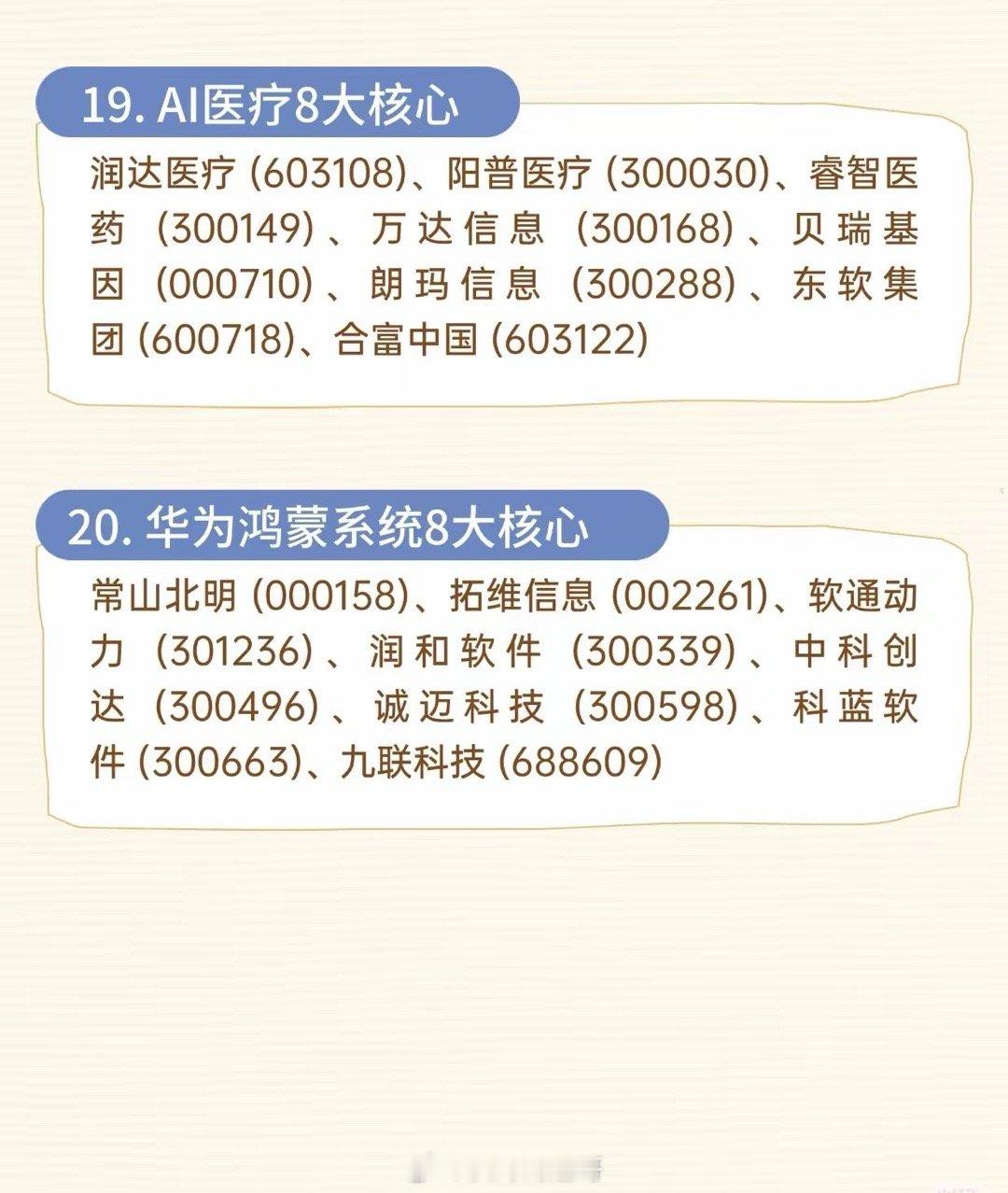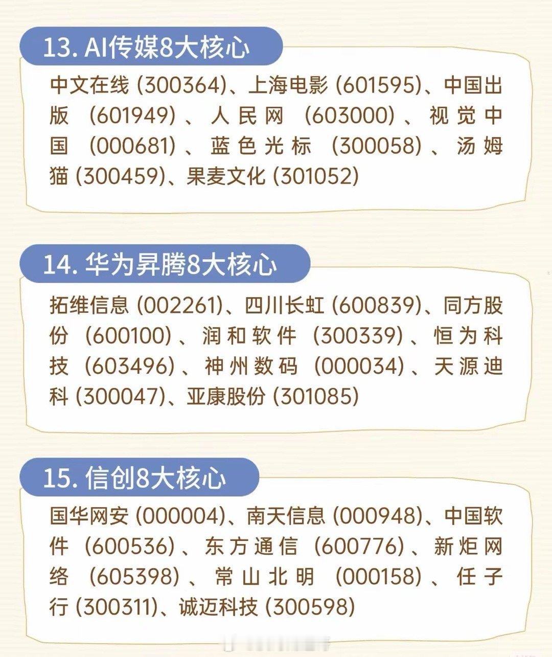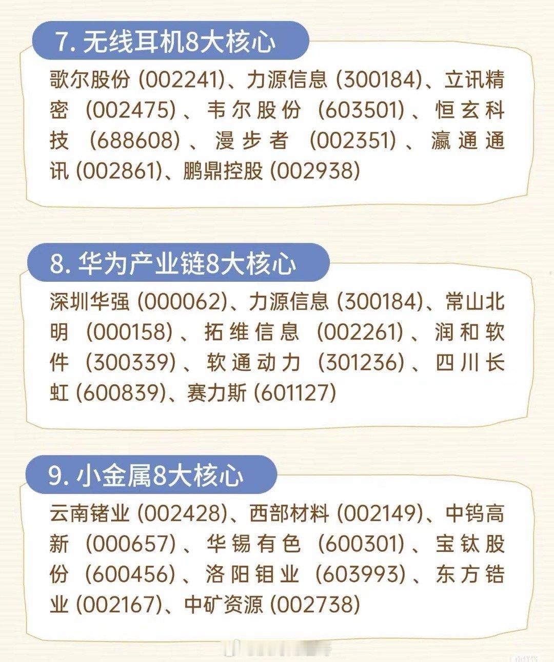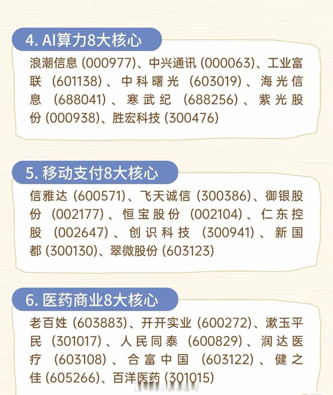 A股160家核心龙头股票:光通信8大核心,包含中际旭创(300308)、天孚通信(300394)、新易盛(300502)、剑桥科技(603083)、源杰科技(688498)、华工科技(000988)、光迅科技(002281)、联特科技(301205);光伏TOPCon电池8大核心有晶澳科技(002459)、中来股份(300393)、罗博特科(300757)、海源复材(002529)、钧达股份(002865)、天合光能(688599)、东方日升(300118)、捷佳伟创(300724);锂矿8大核心涵盖天齐锂业(002466)、赣锋锂业(002460)、中矿资源(002738)、金圆股份(000546)、江特电机(002176)、融捷股份(002192)、盛新锂能(002240)、永兴材料(002756)。AI算力8大核心,包括浪潮信息(000977)、中兴通讯(000063)、工业富联(601138)、中科曙光(603019)、海光信息(688041)、寒武纪(688256)、紫光股份(000938)、胜宏科技(300476);移动支付8大核心有信雅达(600571)、飞天诚信(300386)、御银股份(002177)、恒宝股份(002104)、仁东控股(002647)、创识科技(300941)、新国都(300130)、翠微股份(603123);医药商业8大核心包含老百姓(603883)、开开实业(600272)、漱玉平民(301017)、人民同泰(600829)、润达医疗(603108)、合富中国(603122)、健之佳(605266)、百洋医药(301015)。无线耳机8大核心,涉及歌尔股份(002241)、力源信息(300184)、立讯精密(002475)、韦尔股份(603501)、恒玄科技(688608)、漫步者(002351)、瀛通通讯(002861)、鹏鼎控股(002938);华为产业链8大核心有深圳华强(000062)、力源信息(300184)、常山北明(000158)、拓维信息(002261)、润和软件(300339)、软通动力(301236)、四川长虹(600839)、赛力斯(601127);小金属8大核心包含云南锗业(002428)、西部材料(002149)、中钨高新(000657)、华锡有色(600301)、宝钛股份(600456)、洛阳钼业(603993)、东方锆业(002167)、中矿资源(002738)。固态电池8大核心,包括鹏辉能源(300438)、翔丰华(300890)、当升科技(300073)、赣锋锂业(002460)、丰元股份(002805)、科森科技(603626)、三祥新材(603663)、孚能科技(688567);CRO8大核心有百花医药(600721)、药明康德(603259)、睿智医药(300149)、昭衍新药(603127)、泰格医药(300347)、博济医药(300404)、康龙化成(300759)、诺思格(301333);国产软件8大核心涵盖中国软件(600536)、中科曙光(603019)、诚迈科技(300598)、恒生电子(600570)。AI传媒8大核心包括中文在线(300364)、上海电影(601595)、中国出版(601949)、人民网(603000)、视觉中国(000681)、蓝色光标(300058)、汤姆猫(300459)、果麦文化(301052);华为昇腾8大核心有拓维信息(002261)、四川长虹(600839)、同方股份(600100)、润和软件(300339)、恒为科技(603496)、神州数码(000034)、天源迪科(300047)、亚康股份(301085);大消费8大核心,涉及酒鬼酒(000799)、五粮液(000858)、洽洽食品(002557)、伊利股份(600887)、京粮控股(000505)、岩石股份(600696)、千味央厨(001215)、品渥食品(300892);光刻胶8大核心有南大光电(300346)、容大感光(300576)、晶瑞电材(300655)、彤程新材(603650)、康达新材(002669)、强力新材(300429)、广信材料(300537)、双乐股份(301036);苹果手机8大核心包含立讯精密(002475)、领益智造(002600)、工业富联(601138)、鹏鼎控股(002938)、歌尔股份(002241)、东山精密(002384)、深南电路(002916)、捷邦科技(301326);AI医疗8大核心有润达医疗(603108)、阳普医疗(300030)、睿智医药(300149)、万达信息(300168)、贝瑞基因(000710)、朗玛信息(300288)、东软集团(600718)。