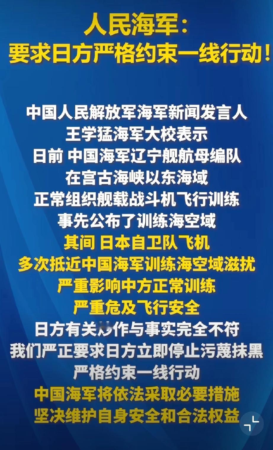 辽宁舰正常训练遭滋扰,中国海军硬气回应…… 咱辽宁舰航母编队在宫古海峡以东海域正常搞舰载机飞行训练,不仅提前公布了海空域,完全合规合法,结果日本自卫队的飞机屡次抵近滋扰! 这可不是小事啊,既严重影响咱正常训练节奏,还危及飞行安全,简直是没事找事!更气人的是,日方居然还倒打一耙炒作不实信息,纯属污蔑抹黑。 海军发言人直接硬气表态:严正要求日方立刻收手,管好自己的一线行动! 咱中国海军也不是好惹的,会依法采取必要措施,坚决维护自身安全和合法权益,绝不惯着这种无理滋扰! 日本滋扰辽宁舰训练