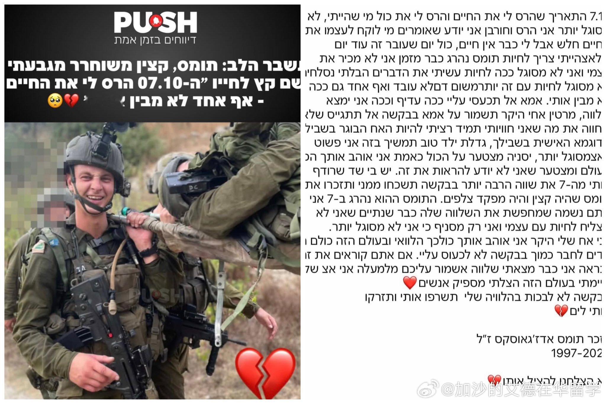 🟥来自“吉瓦提”旅的军官“托马斯·埃兹加奥斯卡斯”自杀身亡。他在心理上长期挣扎,源于他参与了10月7日加沙边境的战斗,以及随后进入加沙地带的地面军事行动。他在事发前发布的帖子中写道:“我已经无法承受,我处于迷失与毁灭之中。我做了不可饶恕的事情,我再也无法与它们共存。从10月7日以来,一个恶魔在我体内追逐着我。请你们忘记我。”你们所犯下的一切罪行,终有一天都会反噬你们自己…🇵🇸✊🏼❤️🩹看见具体的巴勒斯坦人不要停止讨论巴勒斯坦日本自卫队滋扰辽宁舰编队训练