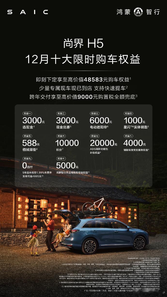 尚界H512月购车权益发布尚界H5 12月十大限时购车权益,助力轻松“尚”车!现在下定,可享至高价值48583元购车权益,跨年交付享至高9000元购置税全额兜底,更有少量专属现车已到店,支持快速提车! 汽场全开鸿蒙智行新能源汽车