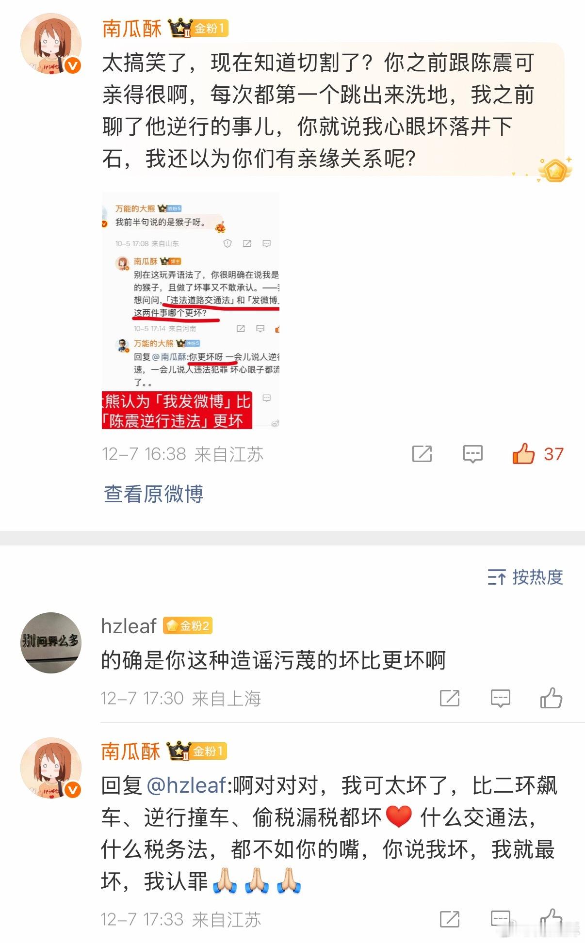 我是真想笑,有些人之前跟陈震大孝子似的,天天给他摇旗呐喊,振臂高呼。现在陈震倒了,他立马就切割,说跟陈震一直不熟,陈震其实是对家的。哈哈,幽默。那你之前帮陈震洗什么地呢?每次陈震出点啥事儿,你都跟孙子一样为他冲锋陷阵。我之前聊了几句陈震逆行的事儿,你就说我「心眼坏、比陈震逆行违法还坏」,俨然一副震爹威武,不可侵犯的态度。他都违反交通法了,我还不能说两句啊?要不是年纪对不上,我都怀疑你们有血缘关系。结果你说好笑不好笑。。人的感情就这么脆弱,现在看陈震要倒,您这切割跑路的速度,比特么闪电博尔特都快。以后叫你「闪电X」算了。 ——以上言论,不特指某个人,而是指一批人,各位自行对号入座