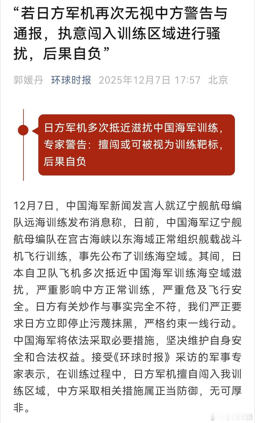 后果自负!日本军机无视中方通报,擅自闯入训练区,即便被雷达照射,也是咎由自取。正如各国在进行导弹或火炮实弹训练时都会划定禁入区域,他国舰机不得进入;若强行闯入,后果自负,这是国际通行的准则。日本自卫队滋扰辽宁舰编队训练黄媒不会说的真相