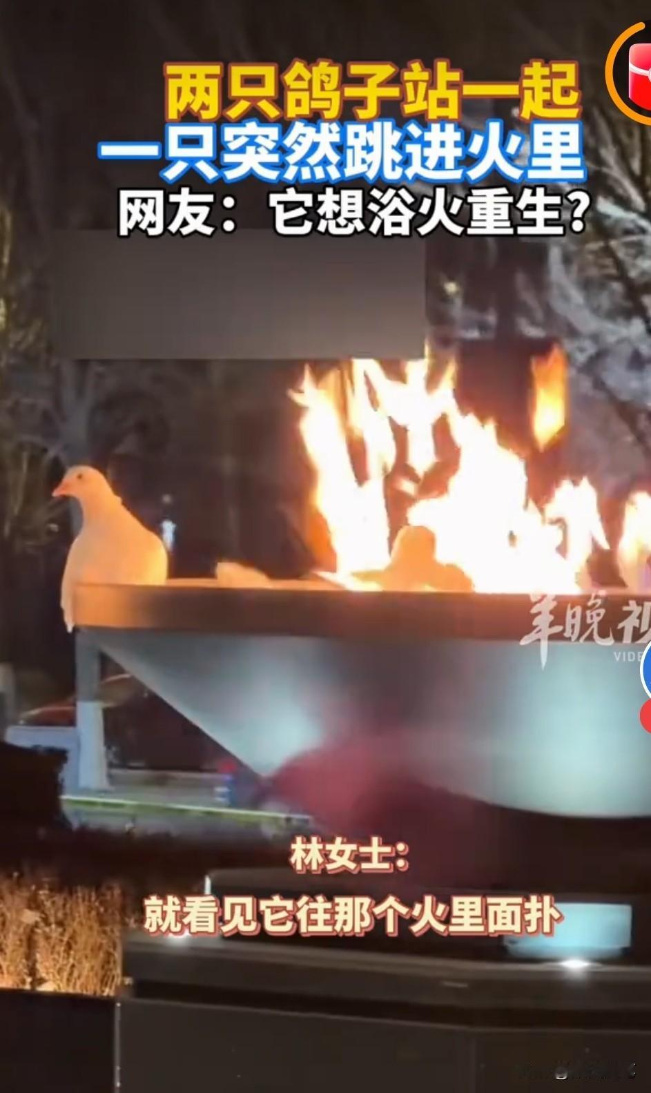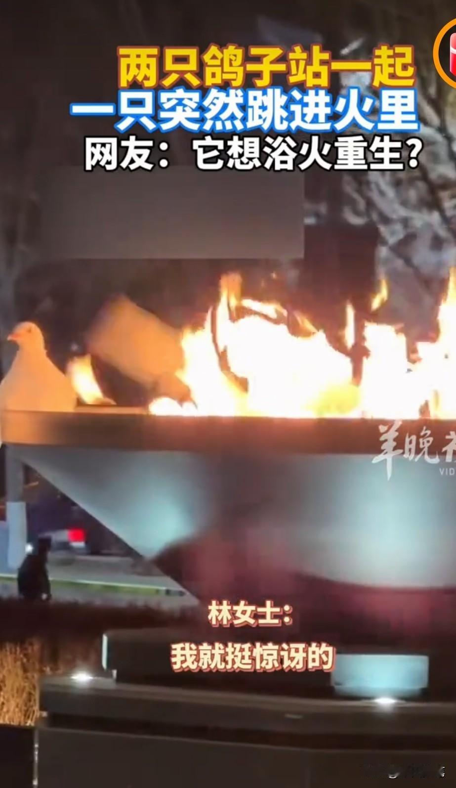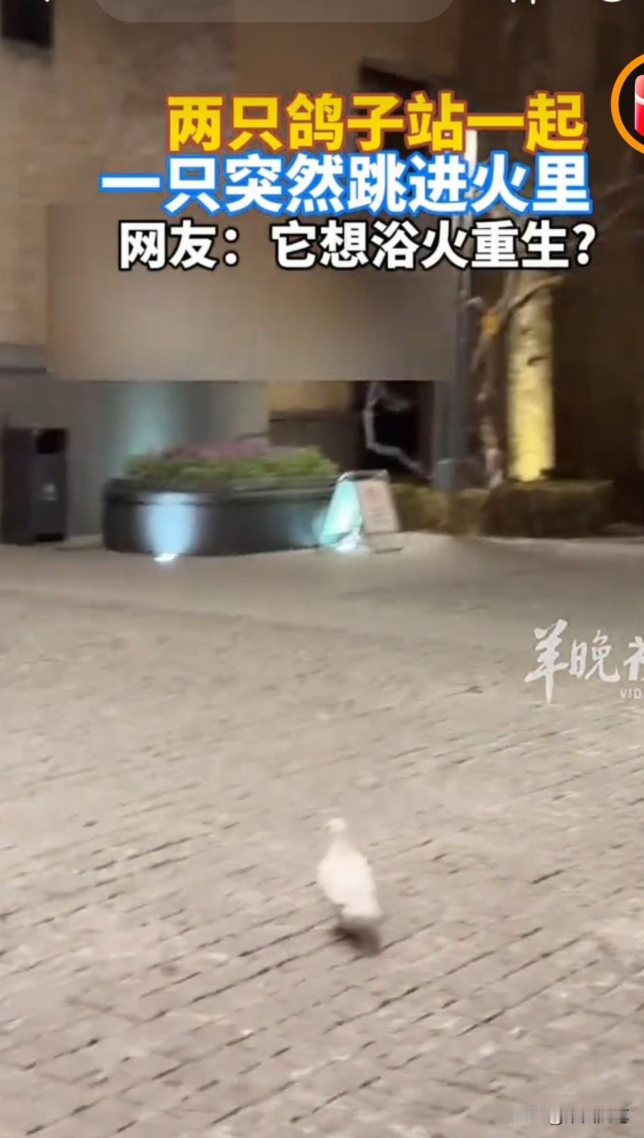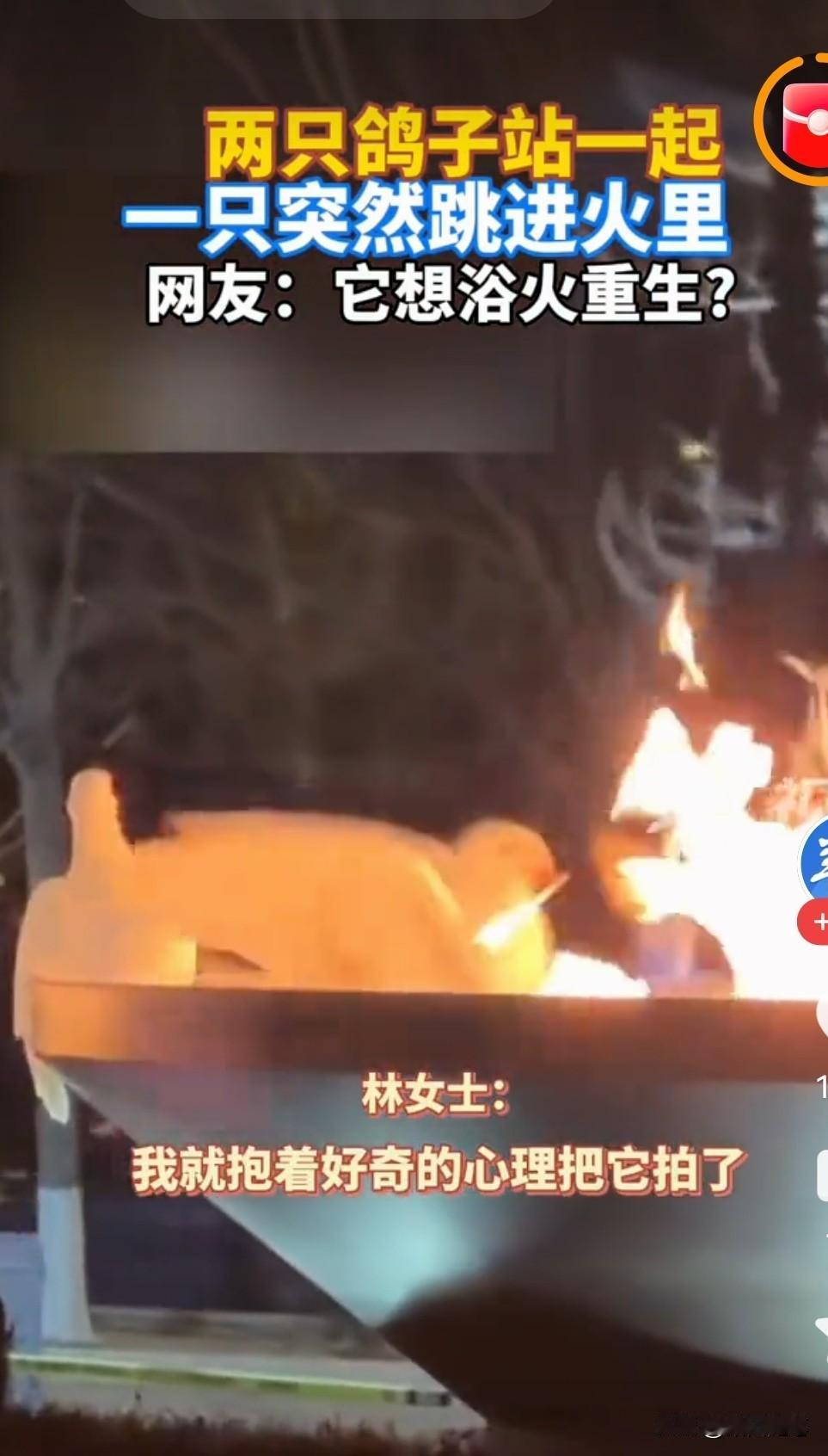 这惊心动魄的一幕, 让人的心揪起来了。 有一女士拍到了这样一段视频。 两只鸽子安静地落在一个火盆边。 突然, 一只鸽子突发奇想, 飞入火盆中。 从视频上能看到, 这只鸽子在火中奋力挣扎了几下。 还好, 最后奋力一跃, 鸽子终于飞出火盆, 安全落地。 真佩服这只鸽子的自救能力。 有网友评论说: “这只鸽子想浴火重生!” 友友们, 为这只鸽子成功自救而点赞! 鸽子 鸽子飞行