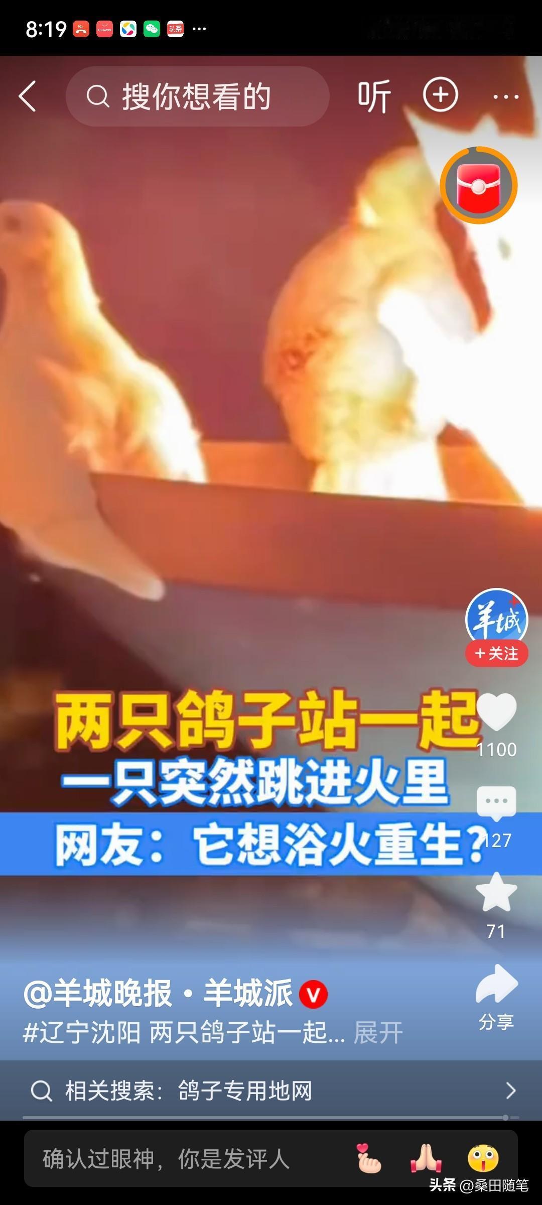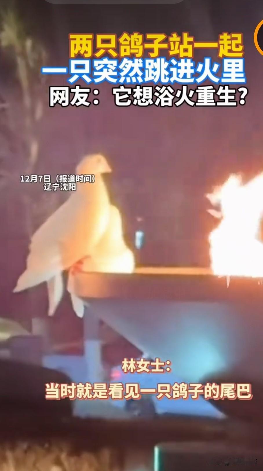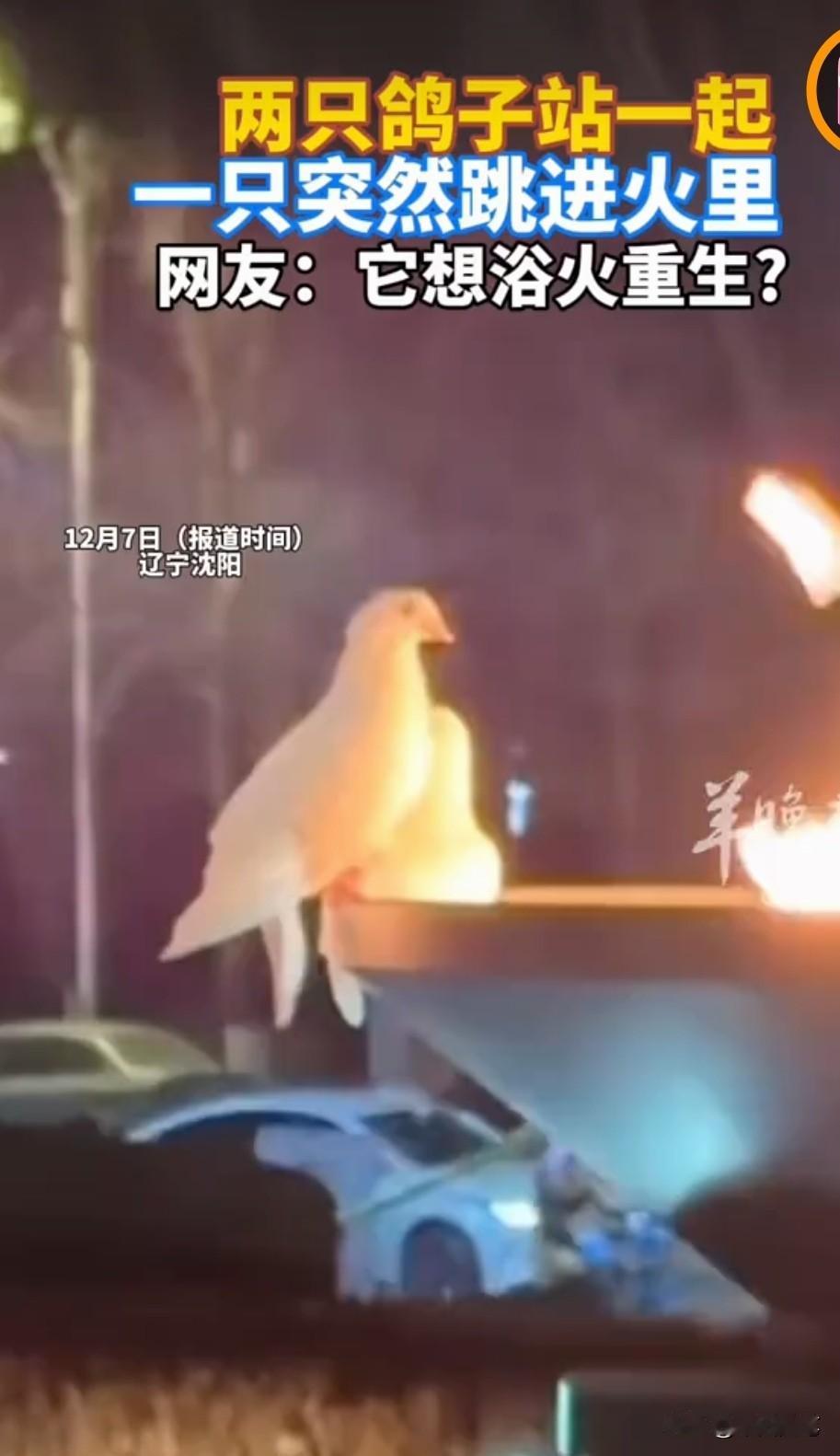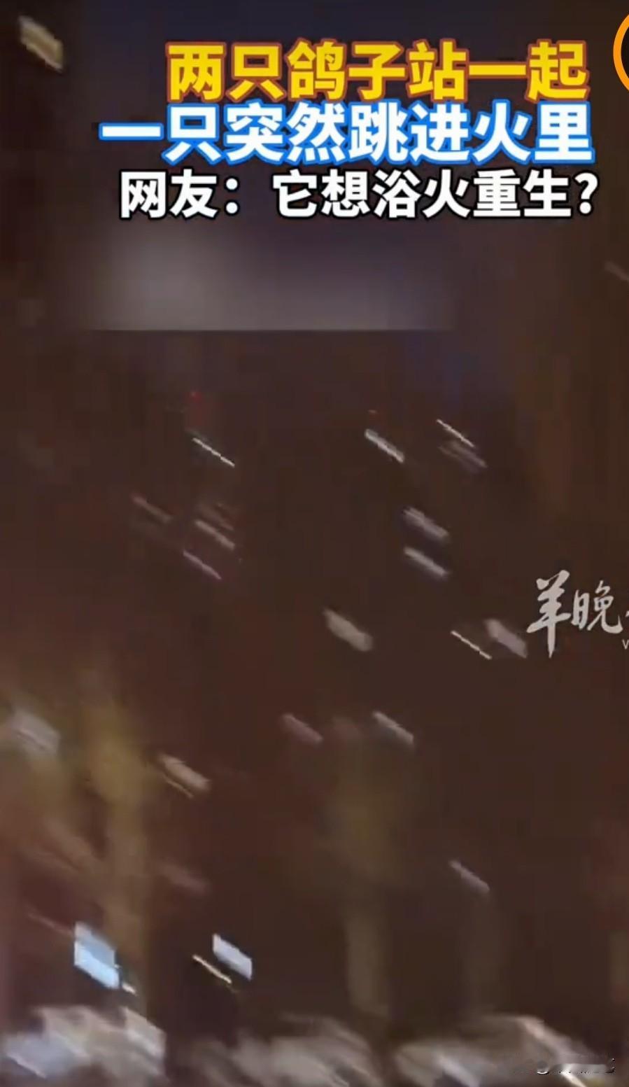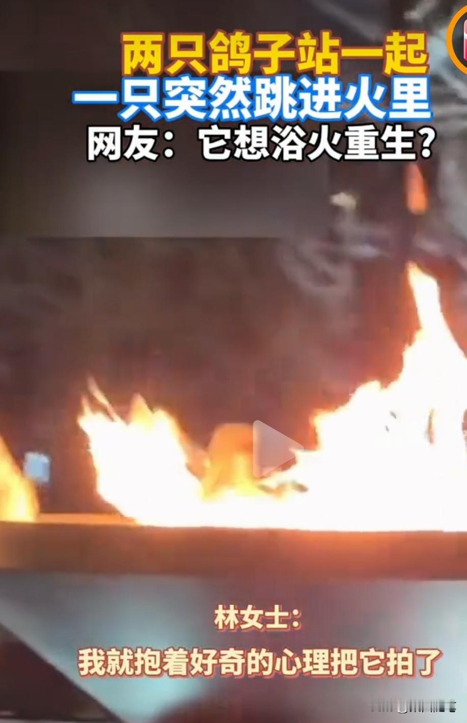 这惊心动魄的一幕, 让人的心揪起来了。 有一女士拍到了这样一段视频。 两只鸽子安静地落在一个火盆边。 突然, 一只鸽子突发奇想, 飞入火盆中。 从视频上能看到, 这只鸽子在火中奋力挣扎了几下。 还好, 最后奋力一跃, 鸽子终于飞出火盆, 安全落地。 真佩服这只鸽子的自救能力。 有网友评论说: “这只鸽子想浴火重生!” 友友们, 为这只鸽子成功自救而点赞! 鸽子 鸽子飞行