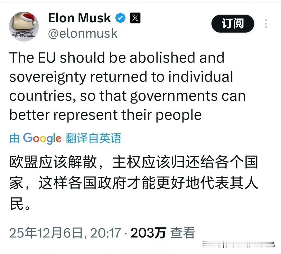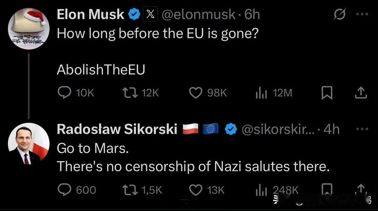 埃隆·马斯克问:“欧盟消失还要多长时间?” 大家都希望欧盟解散,特别是美国。 但依靠欧盟补贴输血的大波波和波罗的海三傻当然不乐意。 所以,大波波外长西科尔斯基气抖冷让马斯克去火星。 不久前,马斯克发文称,欧盟应该解散,主权应该归还给各个(加盟)国家,这样各国政府才能更好地代表其人民。 在肥鹅看来,马斯克的这番看法没毛病。 #马斯克呼吁欧盟解散# #梅德韦杰夫支持废除欧盟#
