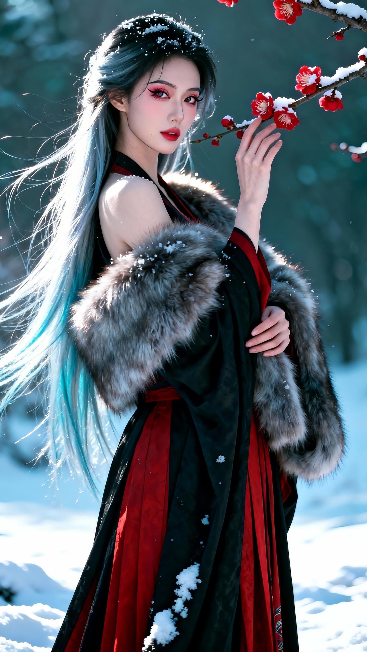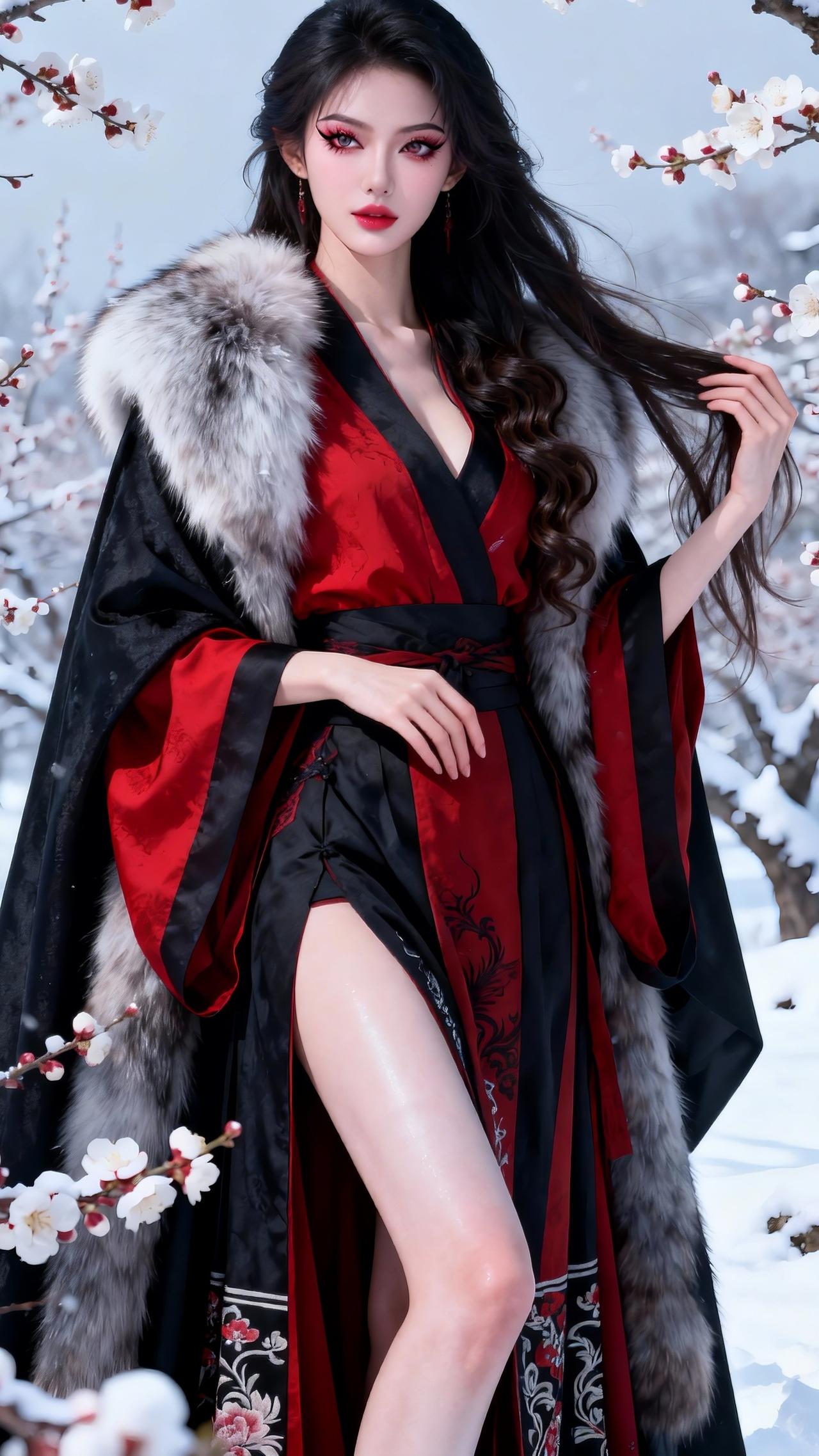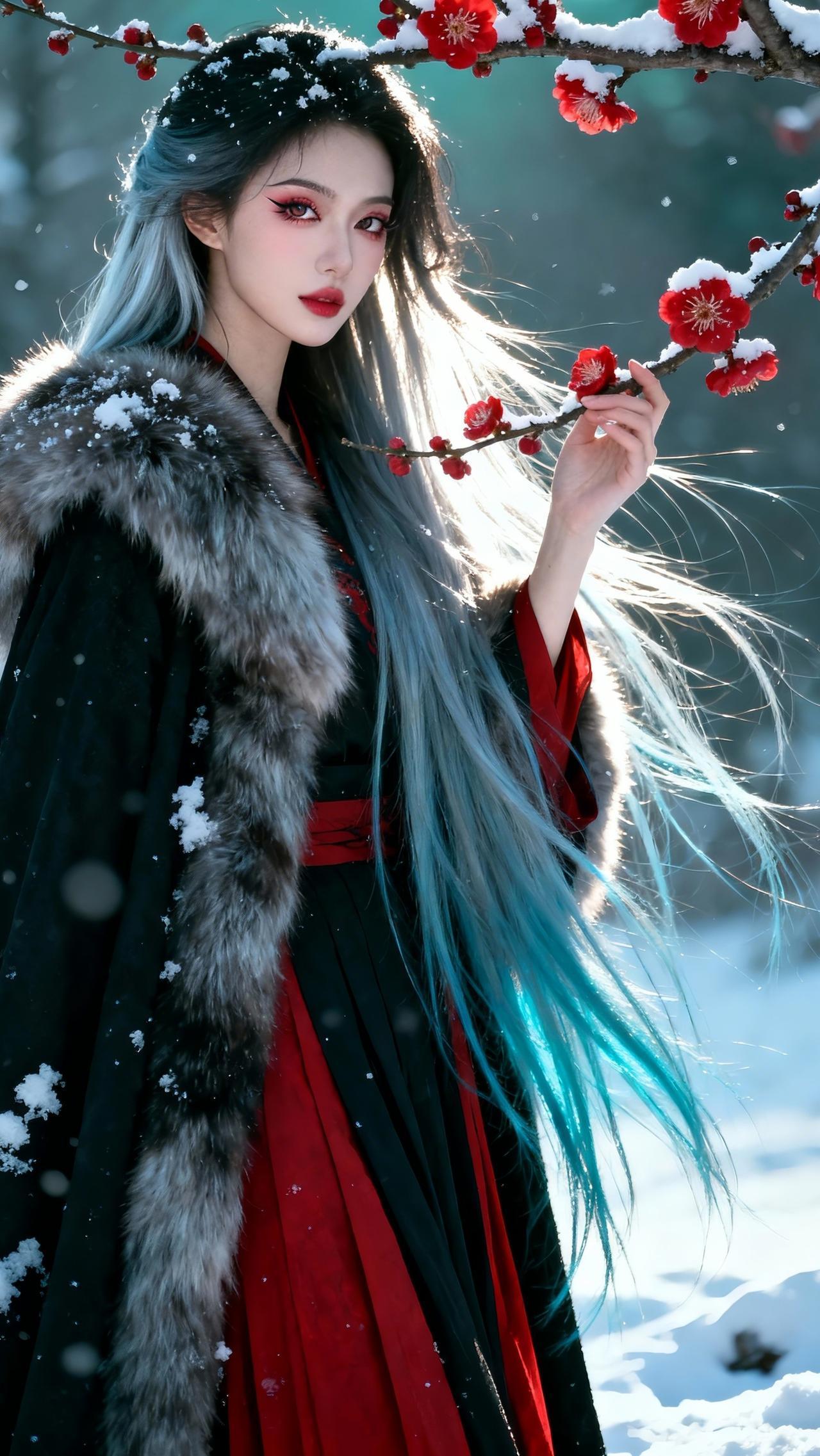 冬日仙境中的红衣美人,雪中绽放的花朵与她相映成趣。在这银装素裹的冬日仙境里,红衣美人轻移莲步,每一步都仿佛踏在梦幻的琴弦上。她那灵动的眼眸,似藏着无尽的温柔与神秘,扫视着周围洁白无瑕的世界。雪花如精灵般纷纷扬扬地飘落,落在她的肩头、发梢,与那鲜艳欲滴的红衣形成鲜明的对比,愈发衬出她的娇艳动人。 她伸手接住一片雪花,嘴角微微上扬,露出一抹甜美的微笑。那笑容,如同冬日里的暖阳,瞬间驱散了周围的寒意。远处,几株傲雪的红梅在雪中傲然挺立,花朵绽放得如火如荼,与红衣美人相互映衬,宛如一幅绝美的画卷。 红衣美人缓缓走向那片红梅,轻轻嗅着梅花的芬芳。她的红衣在风中飘动,与红梅的花瓣一同飞舞,眼神中透露出一丝向往和憧憬。 她静静地站在那里,仿佛时间都为她而静止。这冬日仙境中的红衣美人,就像一颗璀璨的明珠,在雪中绽放着属于自己的光芒,成为了这个寒冷季节里最温暖、最动人的风景。