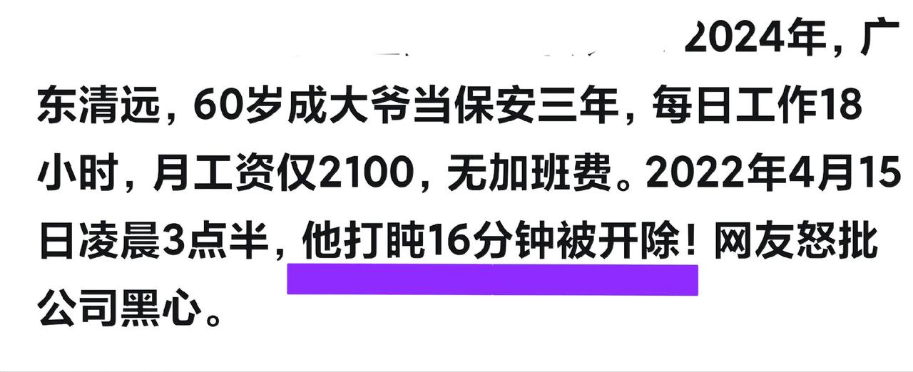这家公司老板是不是太黑心了? 有位60岁的保安,在公司干了3年,月工资仅2100元,每天工作时长竟达18个小时。 有一天,他实在疲惫不堪,只是打了16分钟瞌睡,可运气太差,打瞌睡的这会儿就被老总发现,随后被开除了。 我想问问清远的朋友们,在清远的公司、工厂当保安,工作时间真有这么长吗?工资真会这么低吗? 大家说说,这老板是不是毫无人情味呢?