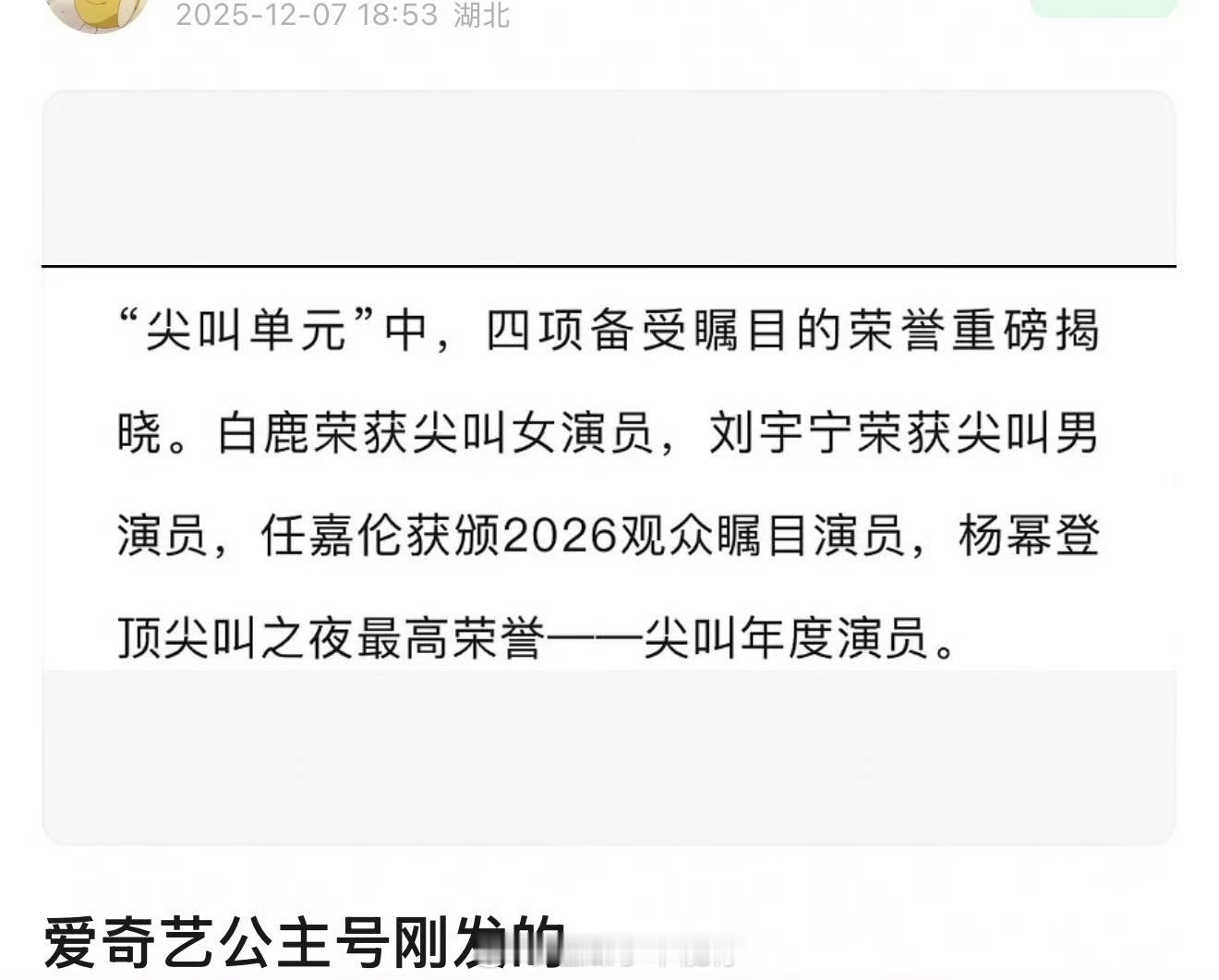 爱奇艺刚才发的,白鹿荣获尖叫女演员,刘宇宁荣获尖叫男演员,任嘉伦获颁2026观众瞩目演员,杨幂登顶尖叫之夜最高荣誉——尖叫年度演员。