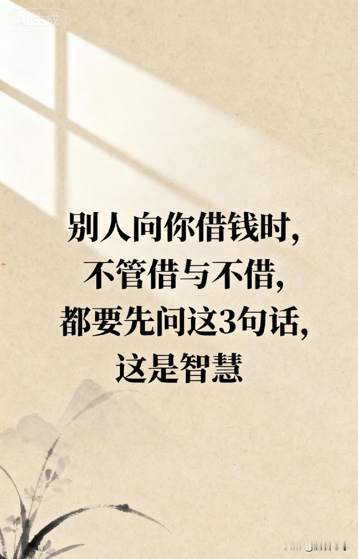 别人向你借钱时,不管借与不借,都要先问这3句话,这是智慧。 心理学有个“借贷悖论”:借钱时他是孙子,还钱时你成了罪人。 但高情商的人掌握了一套心法——不管最后借与不借,开口先问这三句话,能保住90%的关系。 第一句:“遇到什么事了?先跟我说说。” 这句话的智慧在于:区分“救急”与“救穷”。 如果对方说:“家人生病急需手术押金”,这是救急,可以考虑;如果对方支支吾吾:“就是最近手头有点紧”,这是救穷,要警惕。 关键不是听故事,而是听细节。 真正遇到难关的人,能说出具体的时间、医院名称、费用明细。而模糊的叙述背后,往往藏着不愿明说的真相。 这句话还能巧妙传递一个信号:我关心你这个人,胜过关心这笔钱。 无论借与不借,关系已经先暖了一步。 第二句:“大概需要多少?我看看能怎么帮你。” 注意措辞,不是“我能借你多少”,而是“我能怎么帮你”。 这个细微差别,打开了除直接借钱外的其他可能性。 帮忙联系可靠的借贷平台; 介绍临时工作的机会; 甚至一起想办法缩减开支。 这句话的精髓在于:把“要不要借”的问题,转化成了“如何解决问题”的探讨。 如果对方立刻变脸:“你就说借不借吧”,那恭喜你,成功避雷——他看中的不是你的情谊,只是你的余额。 第三句:“你打算什么时候周转开?我这边也有用钱计划。” 这是最重要的压力测试。 靠谱的人会给出明确时间,“下个月15号发工资就还”;不靠谱的人会说:“等我宽裕了就还”,或者“你还不相信我吗”;把还款时间具体化,是检验对方诚意的试金石。 同时这句话也设立了边界:我有我的规划,帮你不是无底线的。既表达了愿意相助的善意,也暗示了“这笔钱我有用途,请按时归还”。 如果决定不借,可以这样说: “听你说完真的很想帮你,但最近我这边也刚好在办(买房/装修/投资理财),资金都冻住了。要不这样,我帮你问问其他朋友?” 这个回绝公式=共情+事实+替代方案 既保住了对方颜面,也守住了自己钱包。 如果决定借,请加一句: “没问题,不过我习惯写个简单的借条,咱们朋友归朋友,手续归手续,这样谁都安心。” 真正的朋友不会因为你要借条而生气,反而会更敬重你的认真。 借钱本质上是一场人际关系压力测试。 每笔借出去的钱,都站着一段关系的结局。 那些因为你设了边界就远离的人,本来也不是你该留住的人。而那些理解你难处、尊重你规则的人,才值得你用心相待。 记住这个心法,小钱看情分,三五百不指望还的,可以借;中钱看信用,几千上万的,看对方过往履约记录。大钱看抵押,数万以上的,必须有担保。 最后分享一个过来人的感悟,借出去时就要做好收不回来的准备。如果这笔钱的损失会让你失眠,那么从一开始就不要借。 从今天起,当那个熟悉又陌生的对话框再次亮起,你可以平静地打出这三句话。这不是冷漠,而是智慧——真正的善良,需要有边界来守护。 毕竟,最好的借钱之道不是永远当好人,而是永远当清醒的人。 你守护的不仅是你的积蓄,更是你人际关系的纯净度。关系借钱