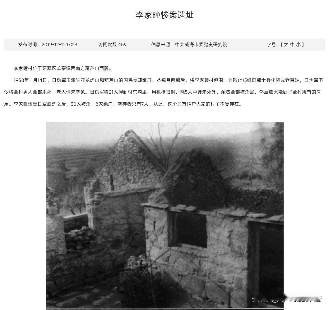 今天看了电影《得闲谨制》,小人物的抗日故事,后劲太大了,回家又和家人叨叨电影中的名场面。 80多岁的奶奶叹气说,现在的人都把这当成了故事,咱老家东面有个兔子窝村(也叫李家疃),就真的发生过。 奶奶说那时候鬼子大扫荡,进村抓抗日的官兵,挨家挨户搜,见着男人就抓就杀。有个本家亲戚躲进草堆里,也没能逃过;还有个汉子在猪圈叉粪,被杀后好几天,尸体还站在那儿……场面很惨,打那以后,这个村就没了。 这事我小时候听爷爷讲过,那时候年纪小,只当是个吓人的故事。这次听奶奶说后,我上网搜了抗日期间日本入侵威海的资料,原来这竟是真实发生过的事,被记载为“李家疃惨案”。 史料里写着,鬼子屠村,李家疃有30人被杀,8家绝户,幸存者仅7人,要么是事发时不在村里,要么是藏起来侥幸躲过一劫。之后剩下的村民搬迁或逃荒到关外,村子就此消失。 我们觉得挺遥远的历史,其实就是我们上两三辈人的亲身经历,它不是电影里虚构的情节,而是那一代人的苦难。 全国范围内,又有多少个“李家疃”,藏着这样不为人知的创伤啊……