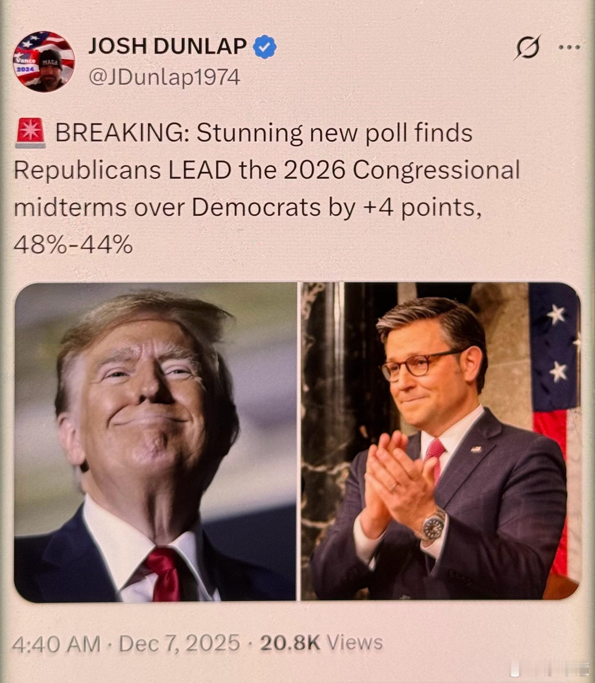 最新民调显示,共和党在2026年国会中期选举中以48%对44%的优势领先民主党4个百分点。