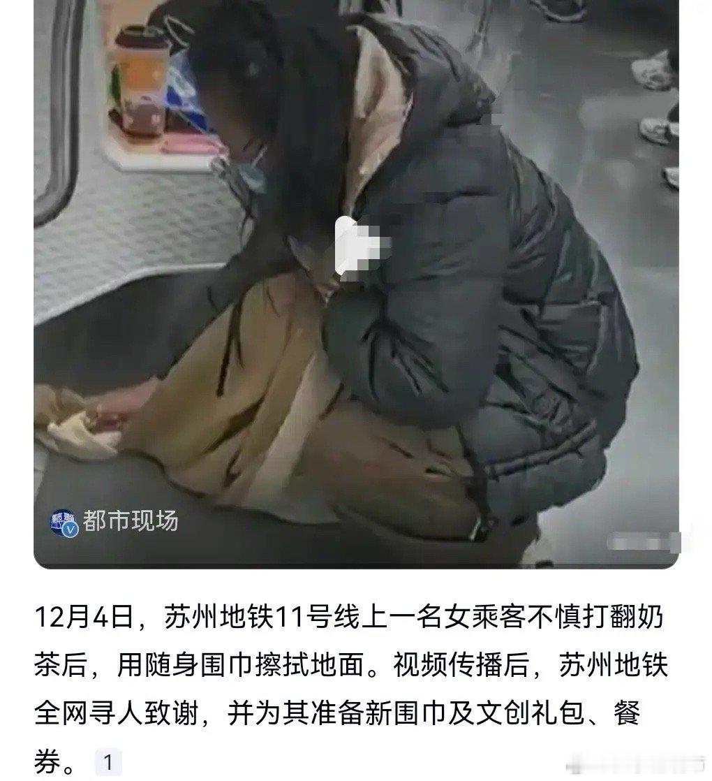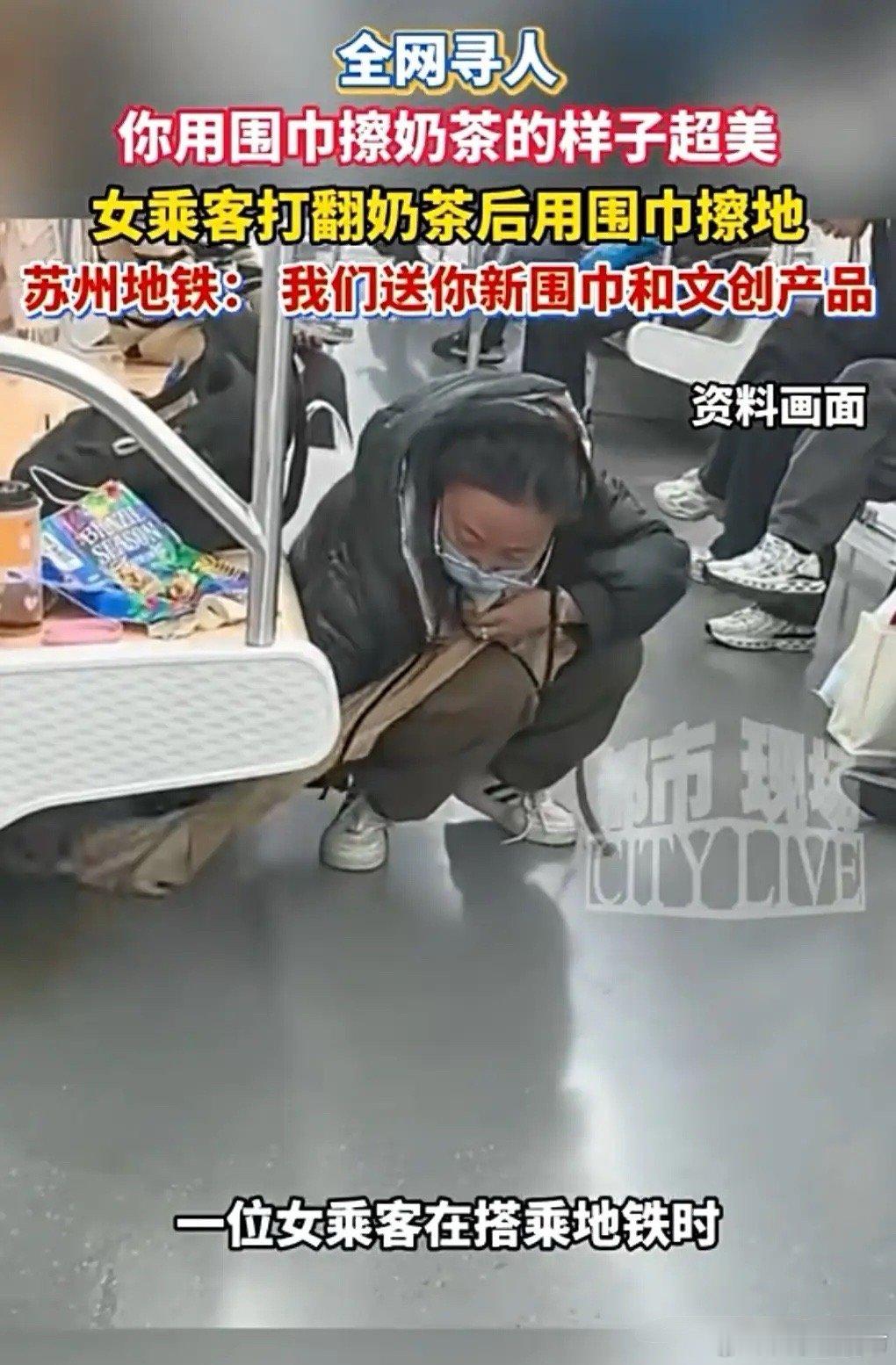 这女孩的品德实在是太高尚了,很多人遇到这样的情况,肯定不会用自己的围巾去擦的。说明女孩是一个非常有责任感的人,她不小心弄脏了地铁,纸巾用完了,所以就用身上的围巾去擦,这是一种伟大的品质。在这个社会已经相当难得了。这样的人品在这个年代已经很稀缺了,太感人了。而地铁方面得知后也在寻找这个姑娘,准备为他她送上一些物品,其中就包括围巾和餐券等。这个围巾送的特别的给力。希望早日找到这个女孩,她也许不是最漂亮的,但她的美好和善良值得人们感动。苏州地铁全网寻找用围巾擦地女孩