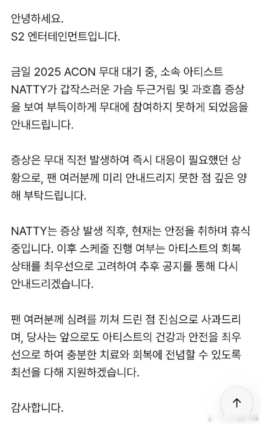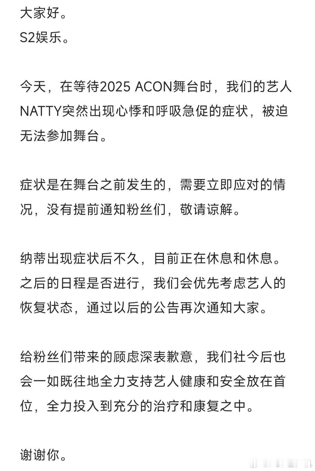 NATTY突然出现心悸和呼吸急促的症状,缺席今天ACON舞台