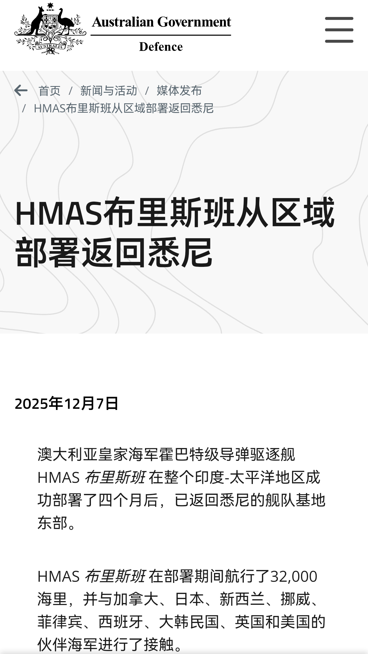 12月7号,澳大利亚国防部发布消息称,布里斯班号驱逐舰结束在印太地区的4个月部署,返回悉尼。部署期间航行32000海里,活动区域涉及日本海、东海,南海菲律宾海等,并与加拿大、日本、新西兰、美国、韩国、菲律宾等多国海上力量进行接触和交流。➤澳大利亚把自己的驱逐舰派到印太地区觉得很骄傲和理所应当,然后却对一支仍在菲律宾海活动的中国海军舰艇编队感到惊讶和害怕。烽火问鼎计划热点观点